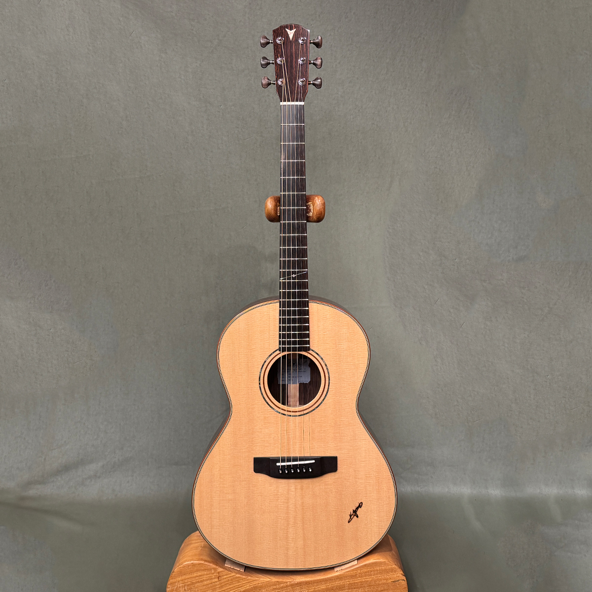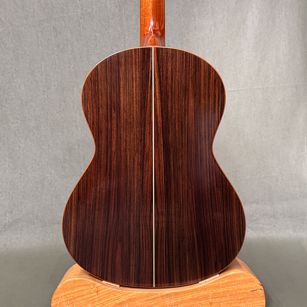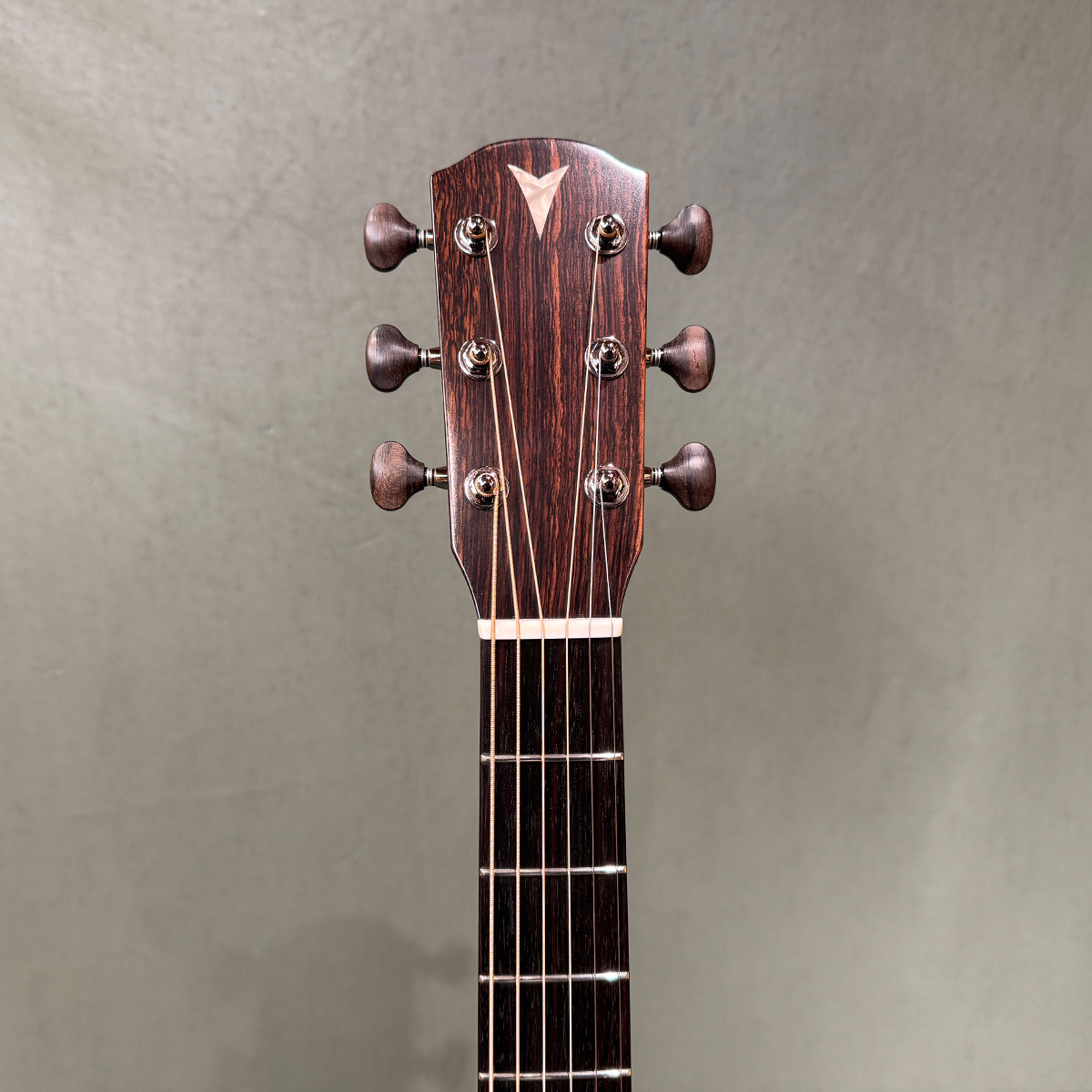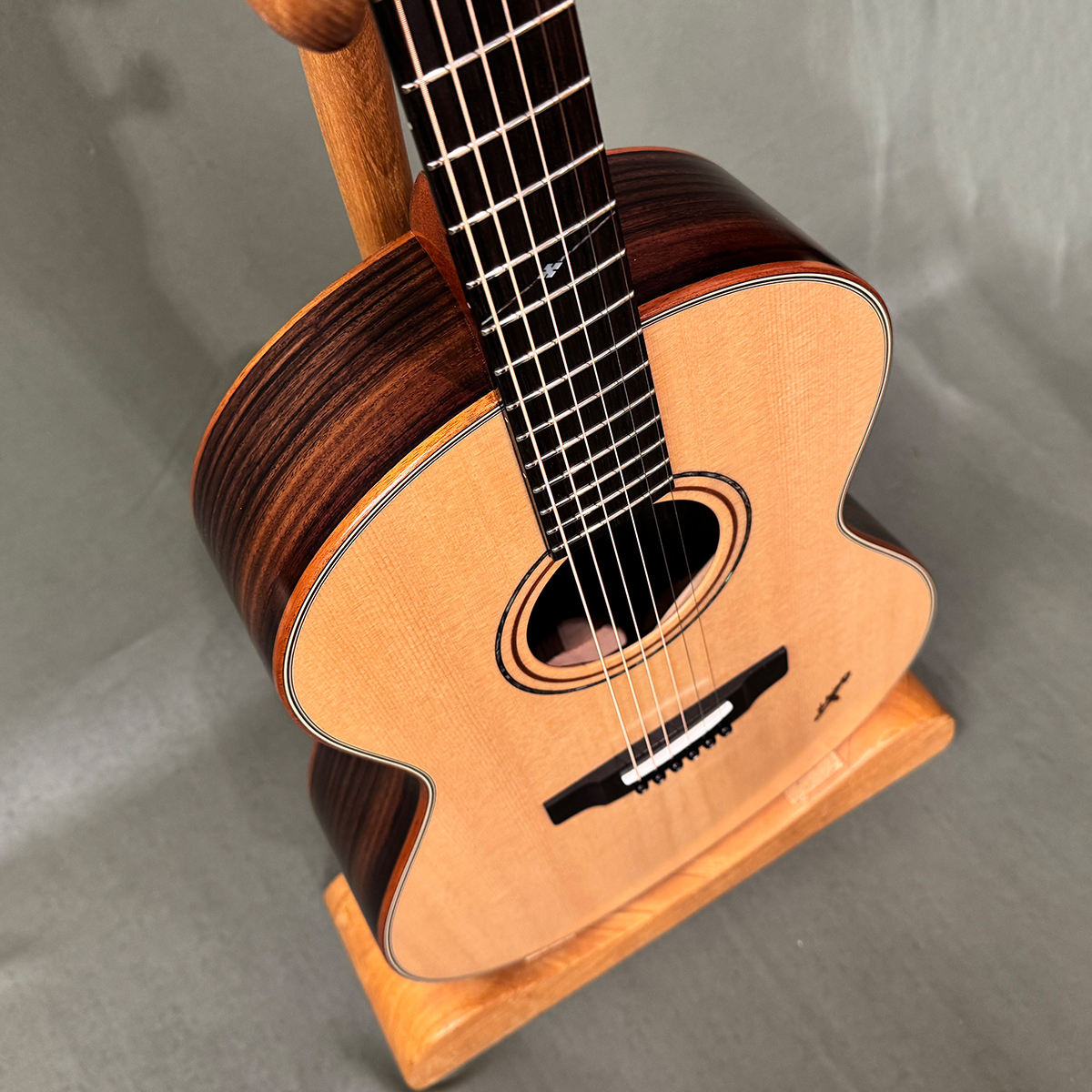 本器は当店からの特注仕様で、ナチュラルが生える美しいシトカスプルースを、半つや出し仕上げにして頂いた1本です。スプルース・インドローズの全面単板であり、純国産ヤイリギターの職人の手によってハンドメイドで組上げられる、ヤイリギターの中でも特に人気のモデルです。ヤイリギターのフラッグシップモデルともいえる本器は、クラシックギターのボディーラインを採用したフォークギターとして80年代からヤイリギター独特のボディータイプとして人気があります。90年代初頭から多くの有名ミュージションが特注することにより、メディアでの露出も増え、同様のモデルを注文する方が絶えません。