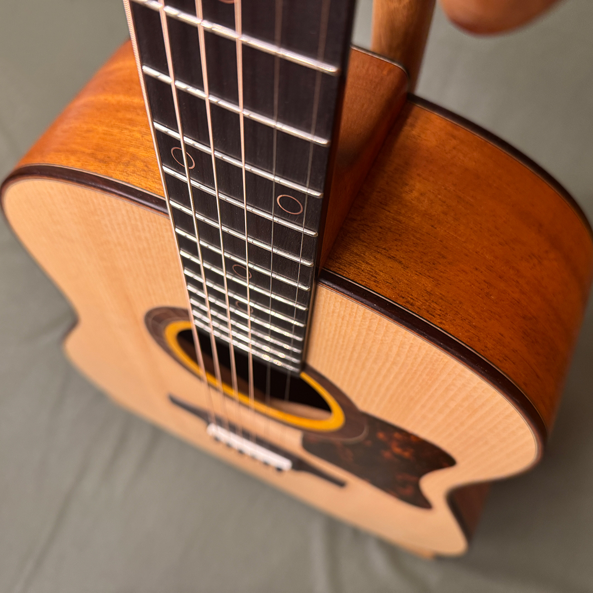 分業制で定められた数だけを生産するという印象の強いヤイリギターですが、個々の職人のノウハウや創造性は高く、独自の考えを組み入れた特別な仕様のモデルを個人作業のみで仕立て上げるのが『ソロワークス』中でも次代を担う若手製作家は多く、Youtubeでも取り上げられている、この澤村氏もその逸材の一人です。