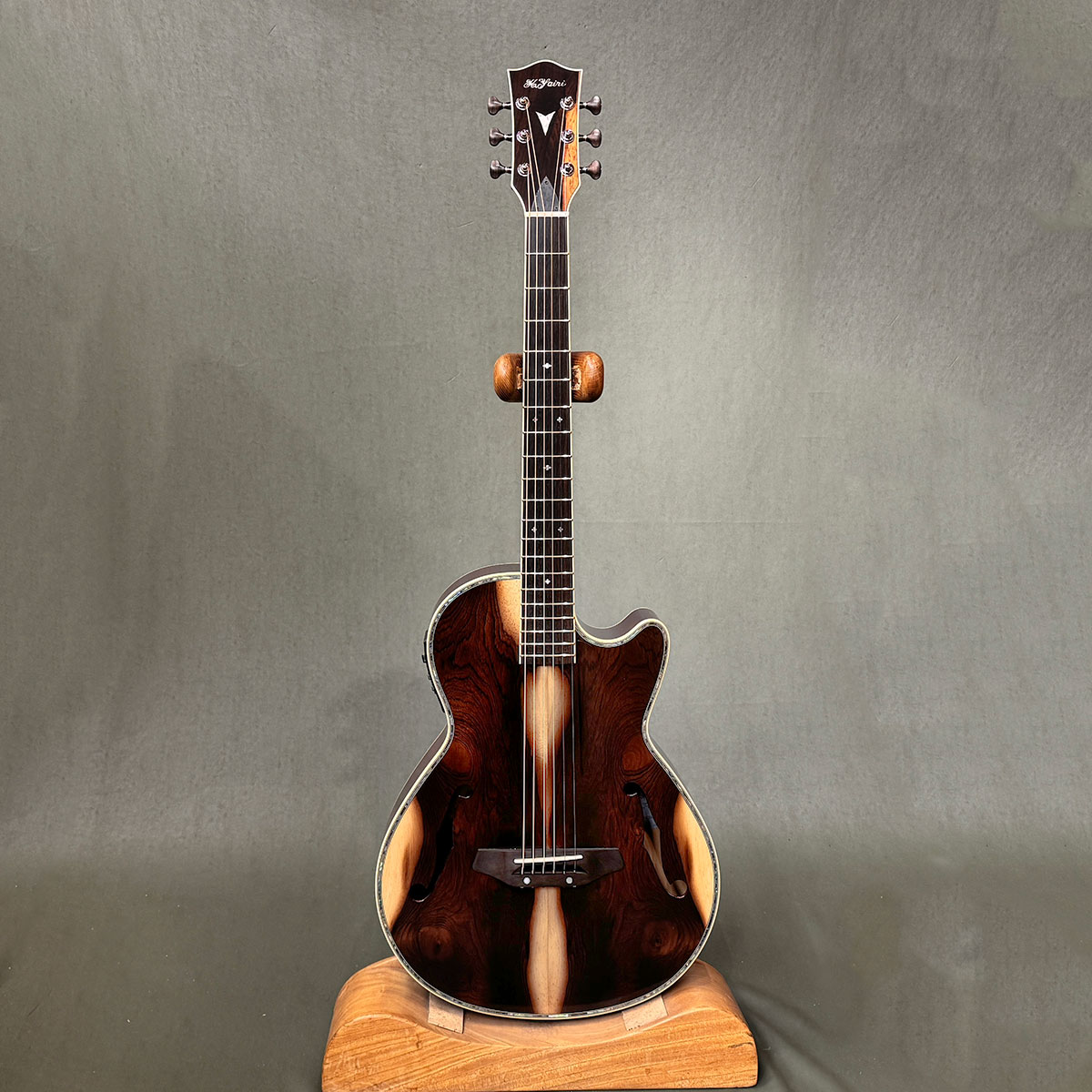 ヤイリギターの特殊エレアコKYFシリーズ。バイオリンやジャズギターのようなF字型のサウンドホールはデザイン性も兼ねていますが、ステージでのハウリングを防ぐために考案されたもので、ボディー内部の共鳴もできる限り抑えられた構造になっております。自宅での音出しにも最適で、サイレントギターとしてもおススメです。