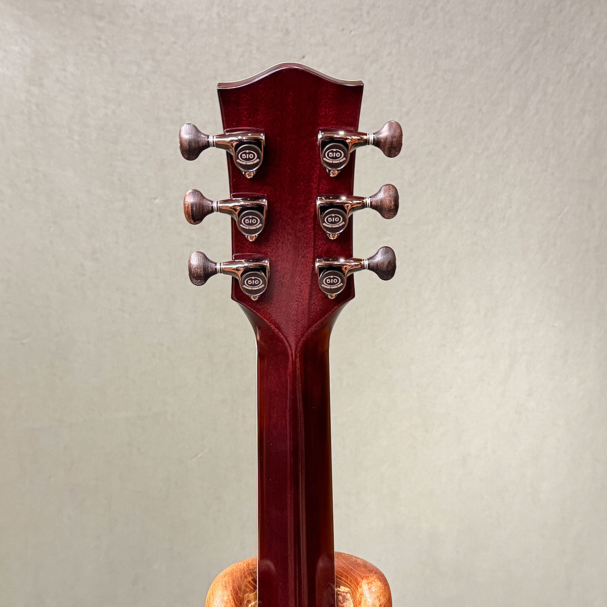 サップの混ざった特殊な木目の2ピース材を使用します。ヘッド天神にもハカランダを用い、糸巻きはジリコーテつまみのGotoh製 SGV510-ZS-CKを採用します。