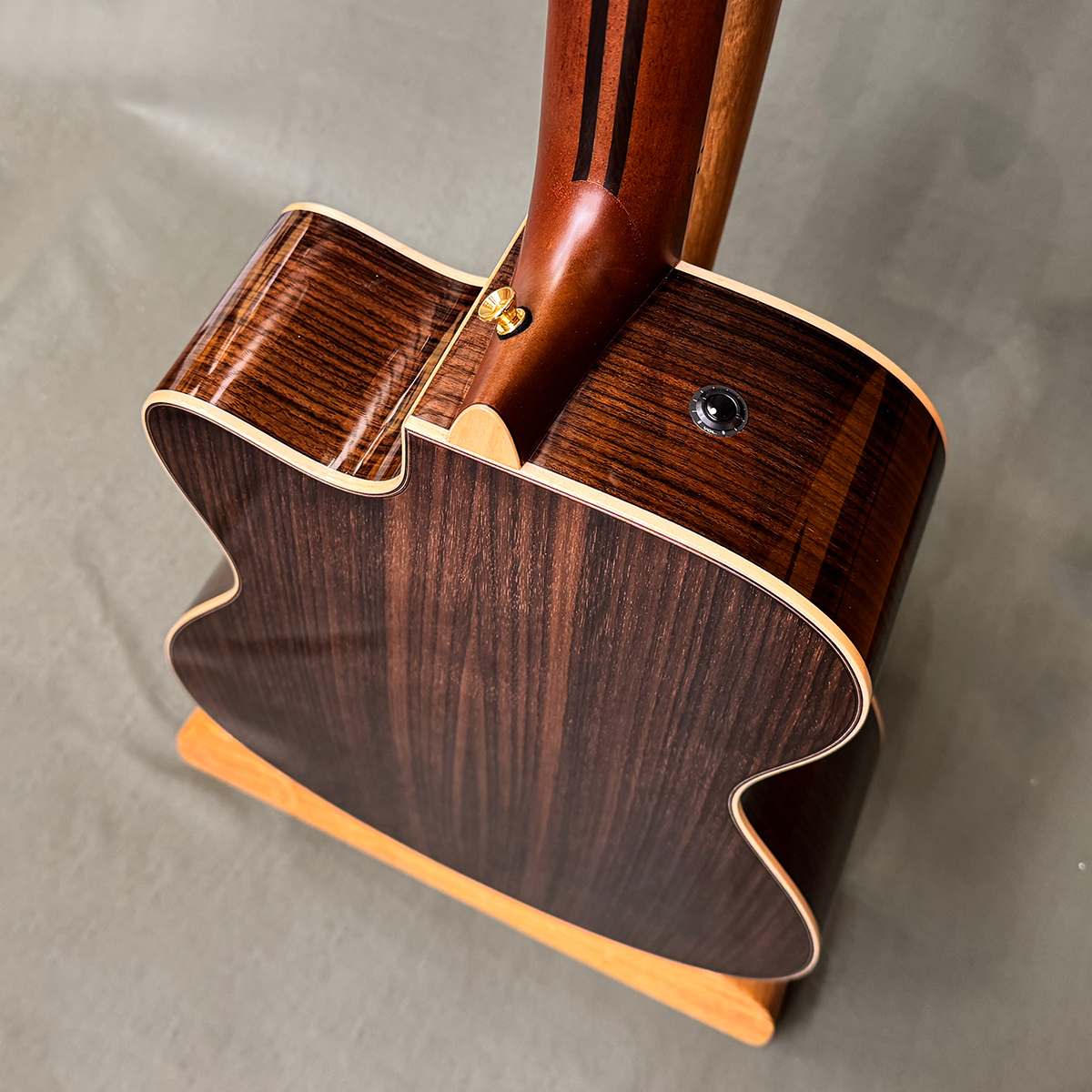 厳選された材と熟練の技が集約された完成度の高いフォークカッタウェイタイプのギターです。優れたレスポンスと、幅広い音域で豊かに伸びる音色が特長のイングルマンスプルース単板をボディトップに採用しました。サイド&バックにはインドローズ単板を採用。ノンスキャロップ・Xブレイシング、スクエア・フレーム構造、新開発Cブロックが、ギター全体を力強く響かせ、太くハリのあるサウンドを生み出します。