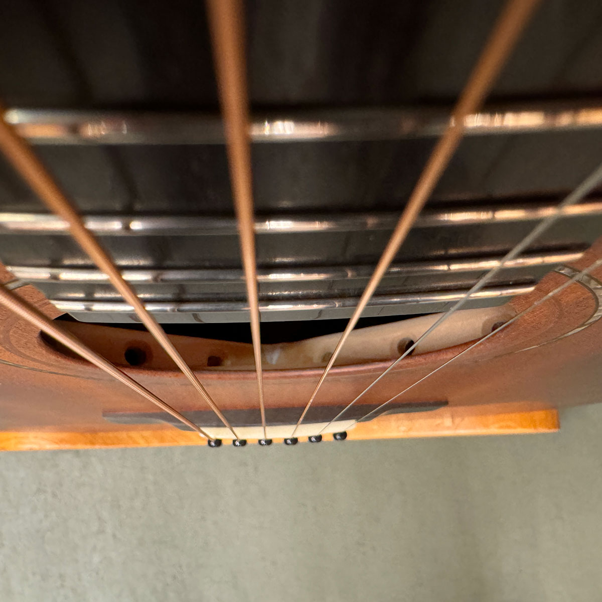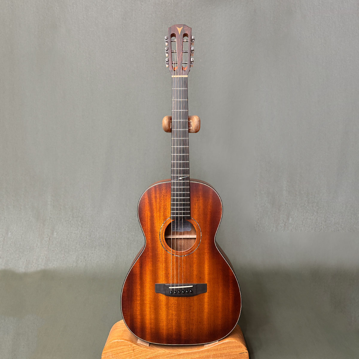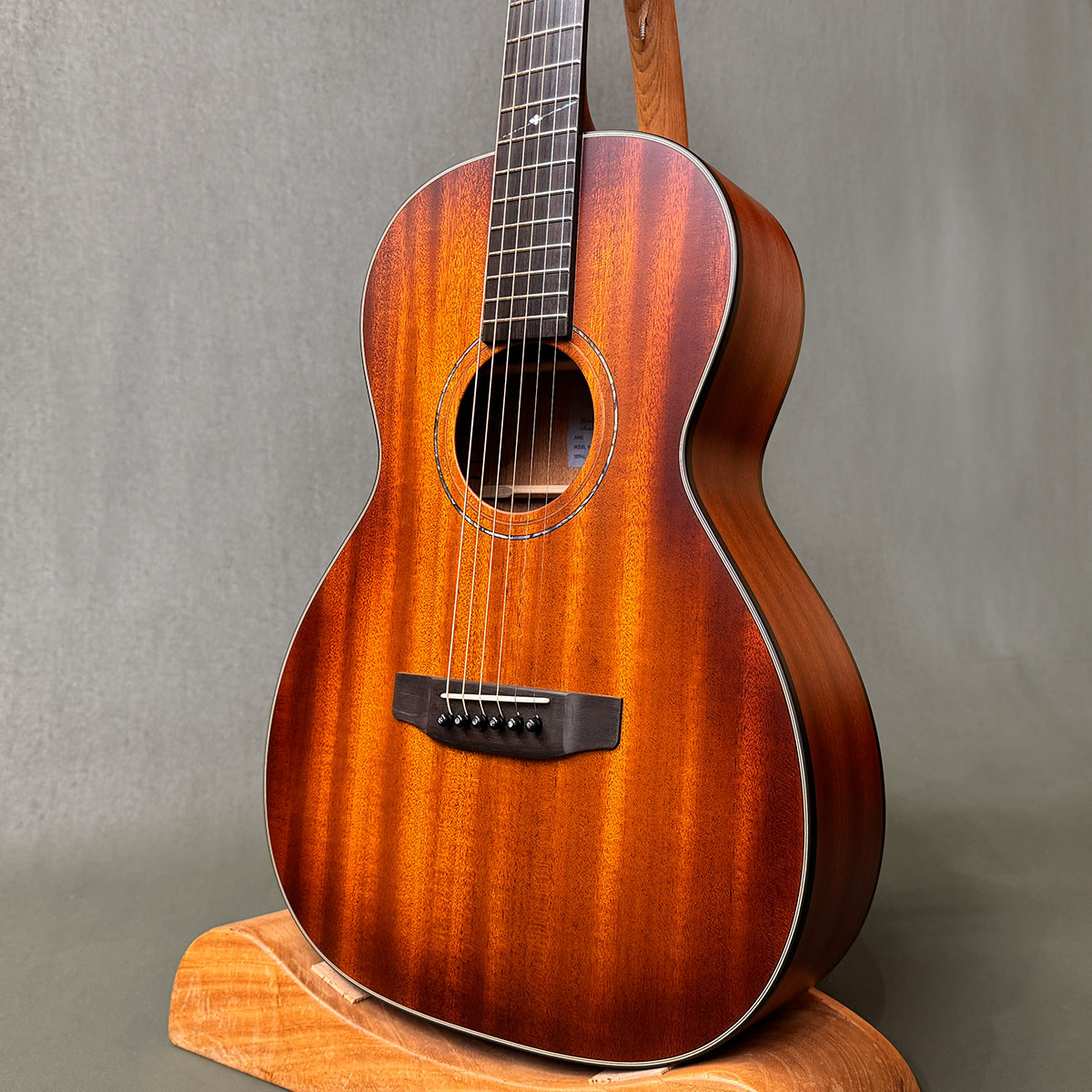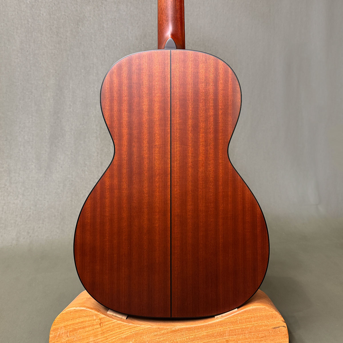 エアリーブレース、マホガニートップ単板、609mmスケール、43mmナット、マホガニー埋め込みロゴ、2本限定で製作していただいたニューヨーカーのオールマホ仕様。歯切れのよいサウンドはスプルーストップのオリジナルとは異なる余韻を生み出します。味が出るまで延々と弾き続けて頂きたい1本です。