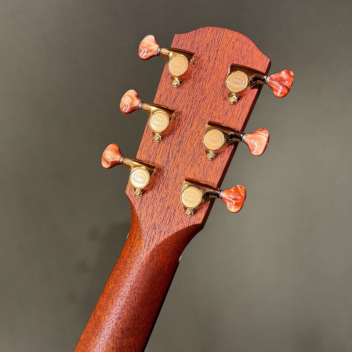 殺風景なウクレレルックにならないよう、マホガニーながらトップにはアンティークバーストの塗装を施しています。間近でみると圧倒的な存在感です。糸巻きのつまみは全体の印象に合わせてスモールサイズのアンバートーンにしました。反射がないので映り込みがないのも現代のユーザーにはオススメの条件ではないでしょうか