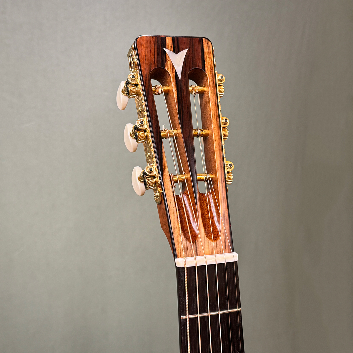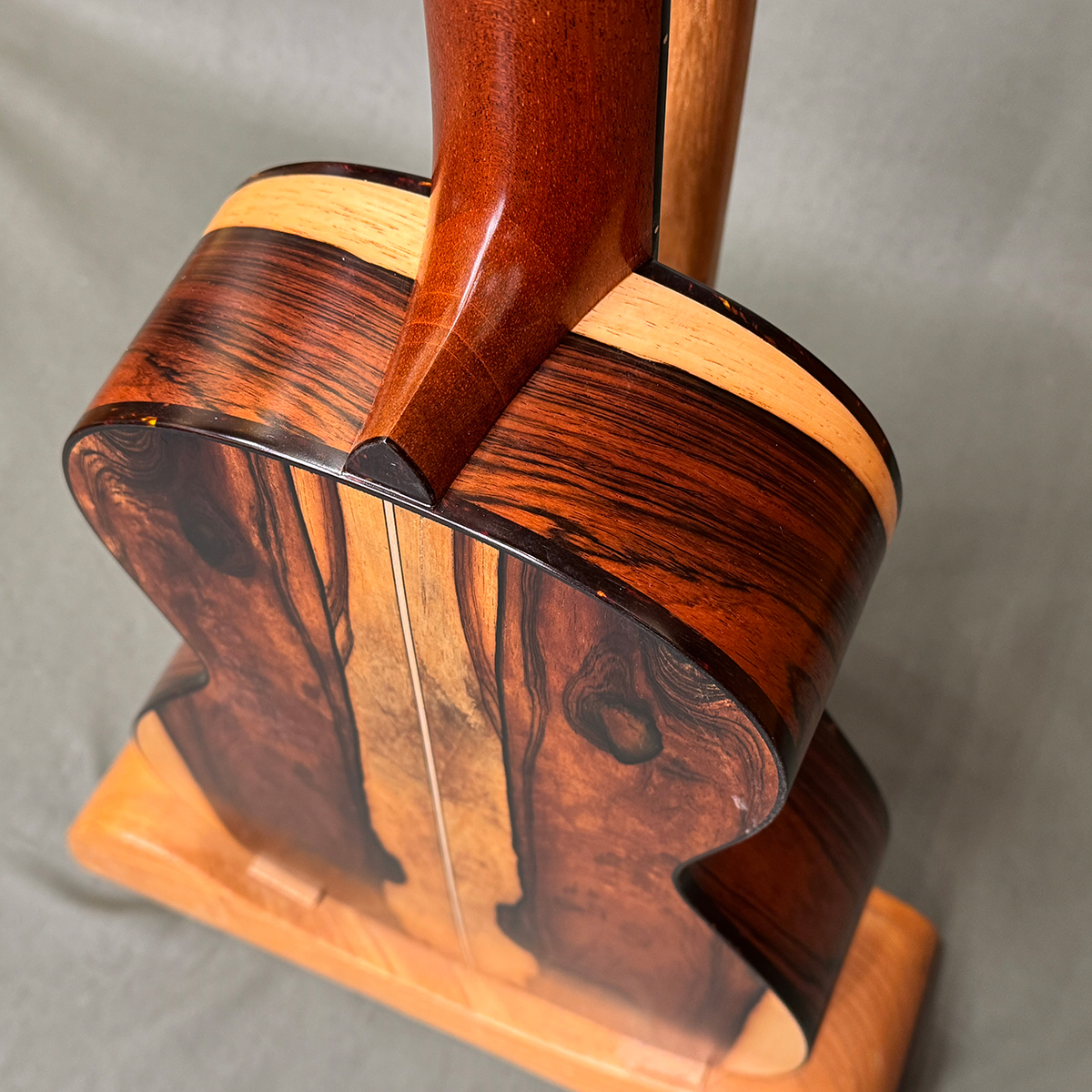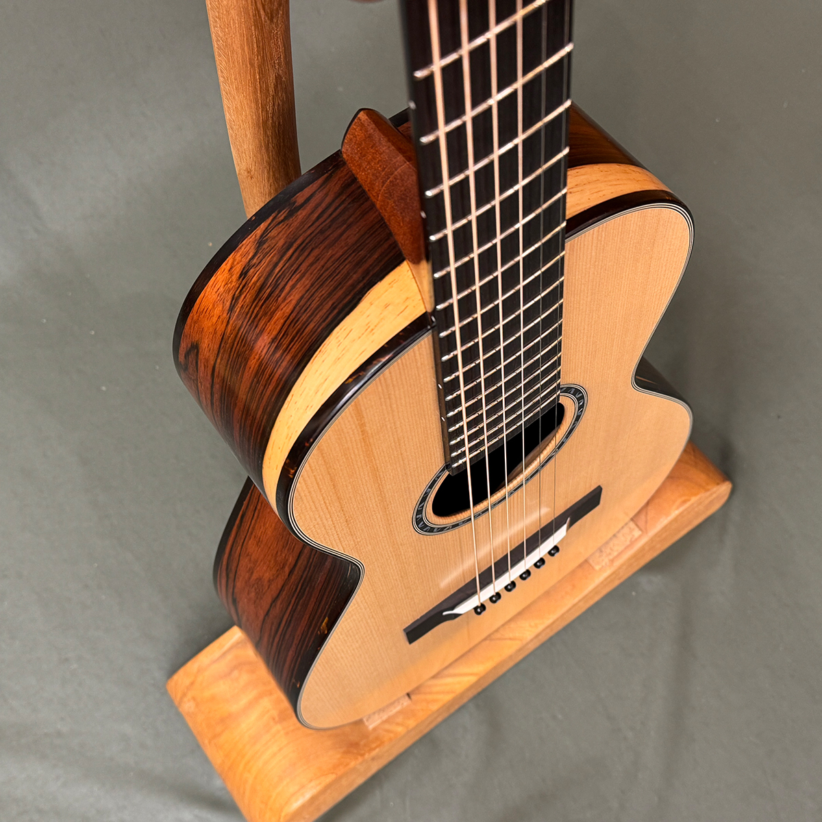 小ぶりなボディながら、ハカランダの持つ芯の強さと倍音の豊かさが加わり、フィンガースタイルやブルース、古いフォークソングとの相性は抜群。