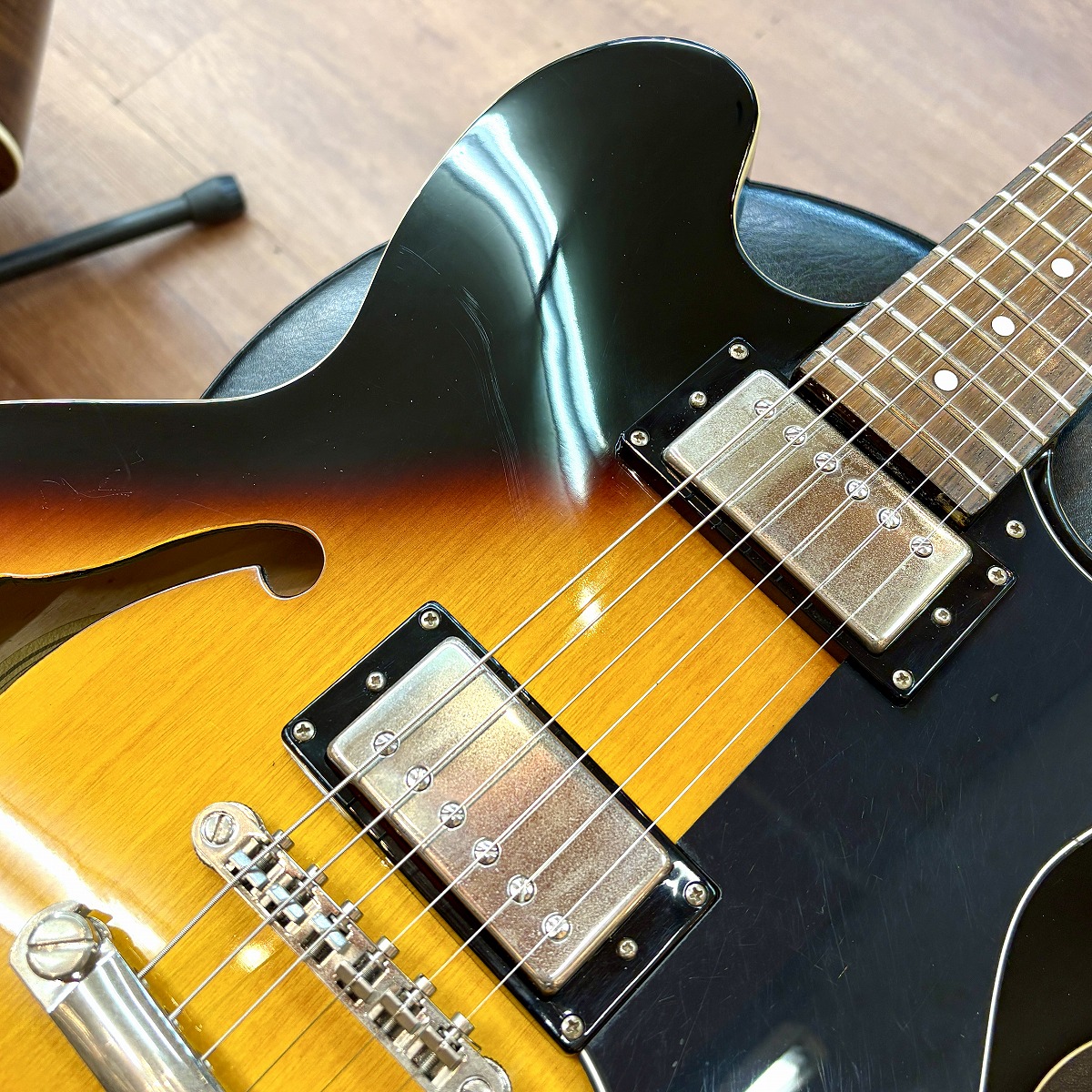 センターブロック構造による豊かな箱鳴りと、ハムバッカーならではの太く温かいトーンが魅力です。