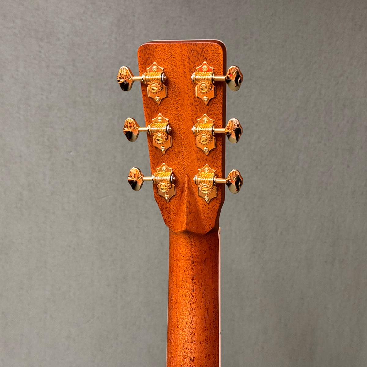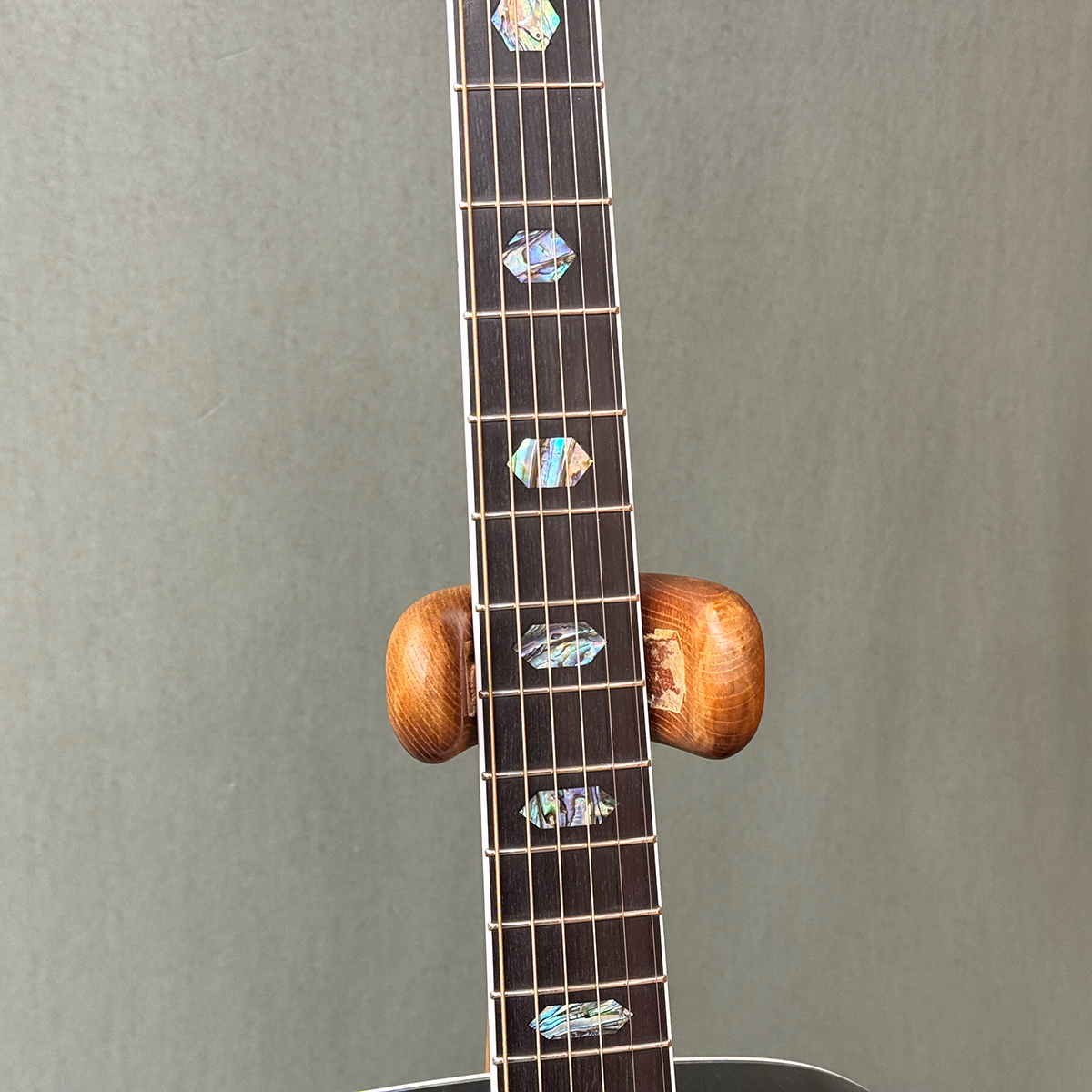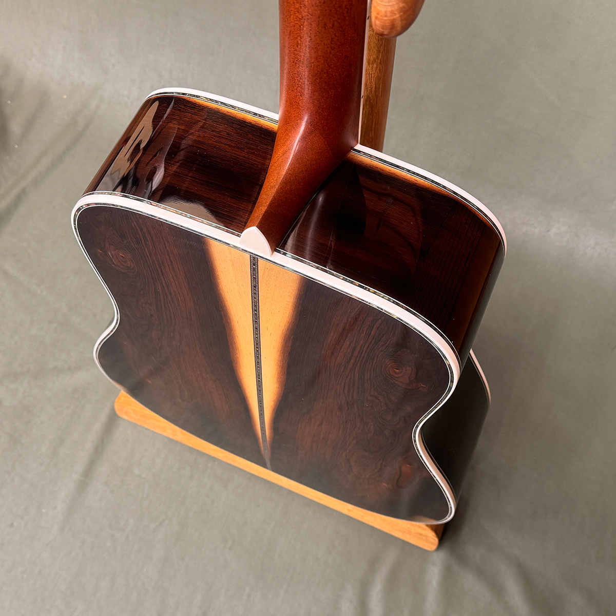 YW-1000は通常42mmの極細ネックで作られます。バックのハカランダも希少であるということから3ピースでの生産となっておりましたが、交渉の結果、下倉楽器では70年代と同様に2ピースバックを更に数あるヤイリギターのハカランダのストックの中から、特別に選定して、納得のいく強烈な木目の物だけを使用して製作していただきます。マーティンやその他のブランド同様幅広ネックを求めるプレイヤーが多いことから、44mmで特注し、ヘッドの上下部幅を狭めることでヘッド落ちに対応した軽量化を図りました。長時間弾いても疲れないのが理想です。