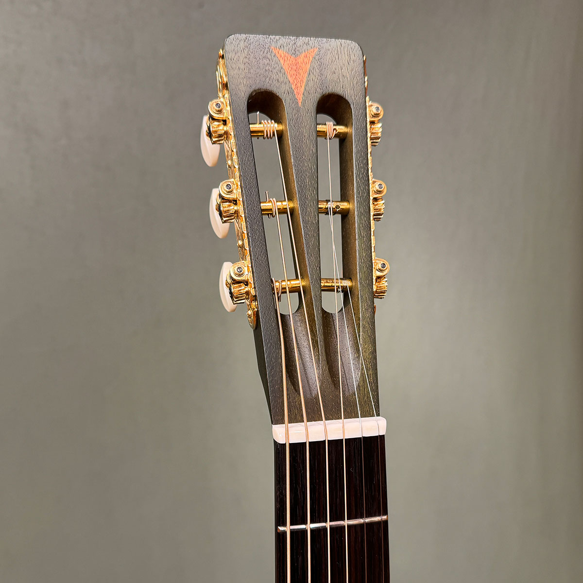 ヘッドのヤイリロゴはシンプルにワンポイント矢じり型のマホガニーを埋め込み、スタイリッシュなデザインに変更。