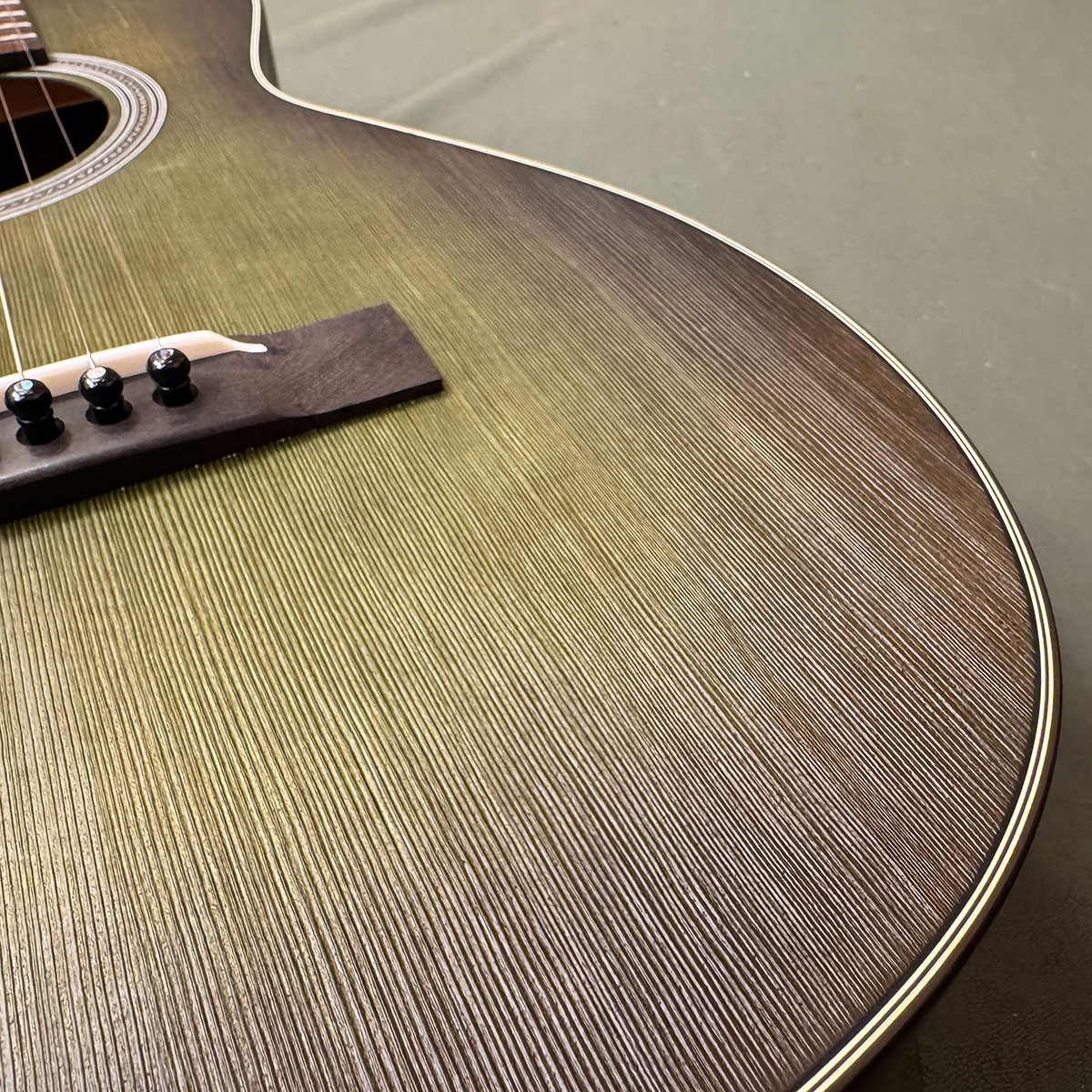 下倉楽器限定カラーのダークモスグリーンと、表板を日本の伝統的技術の『浮造り』加工で仕上げました。