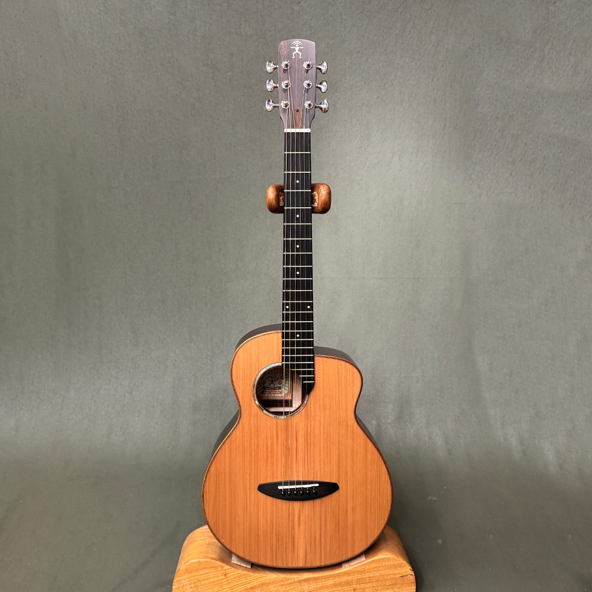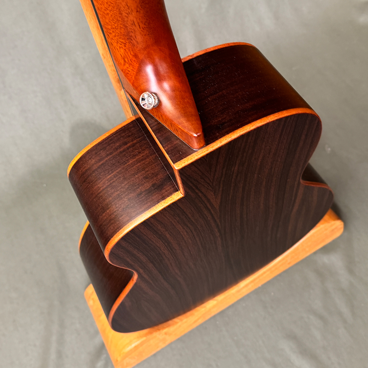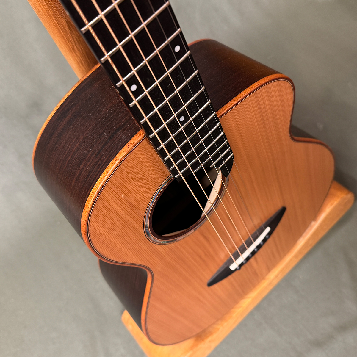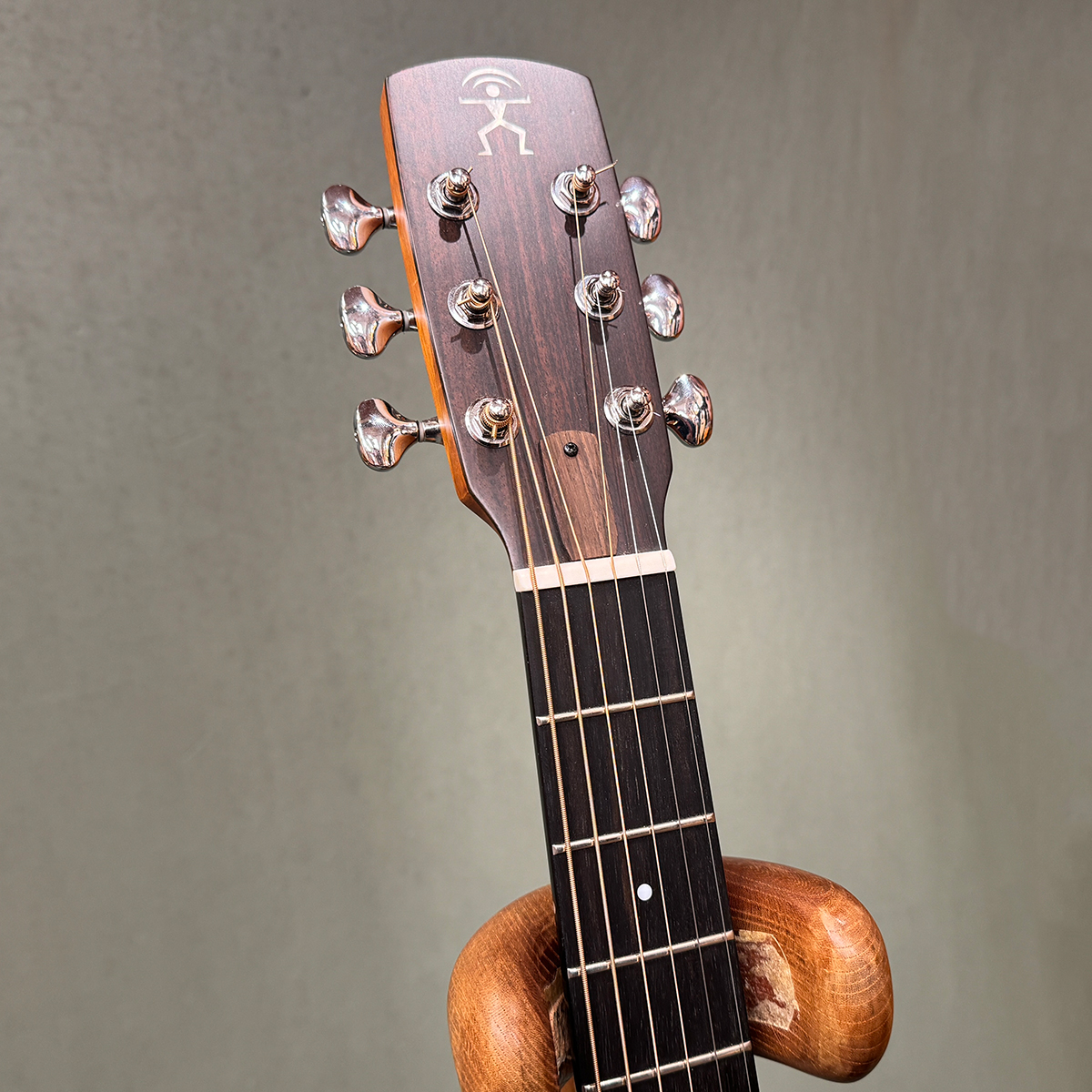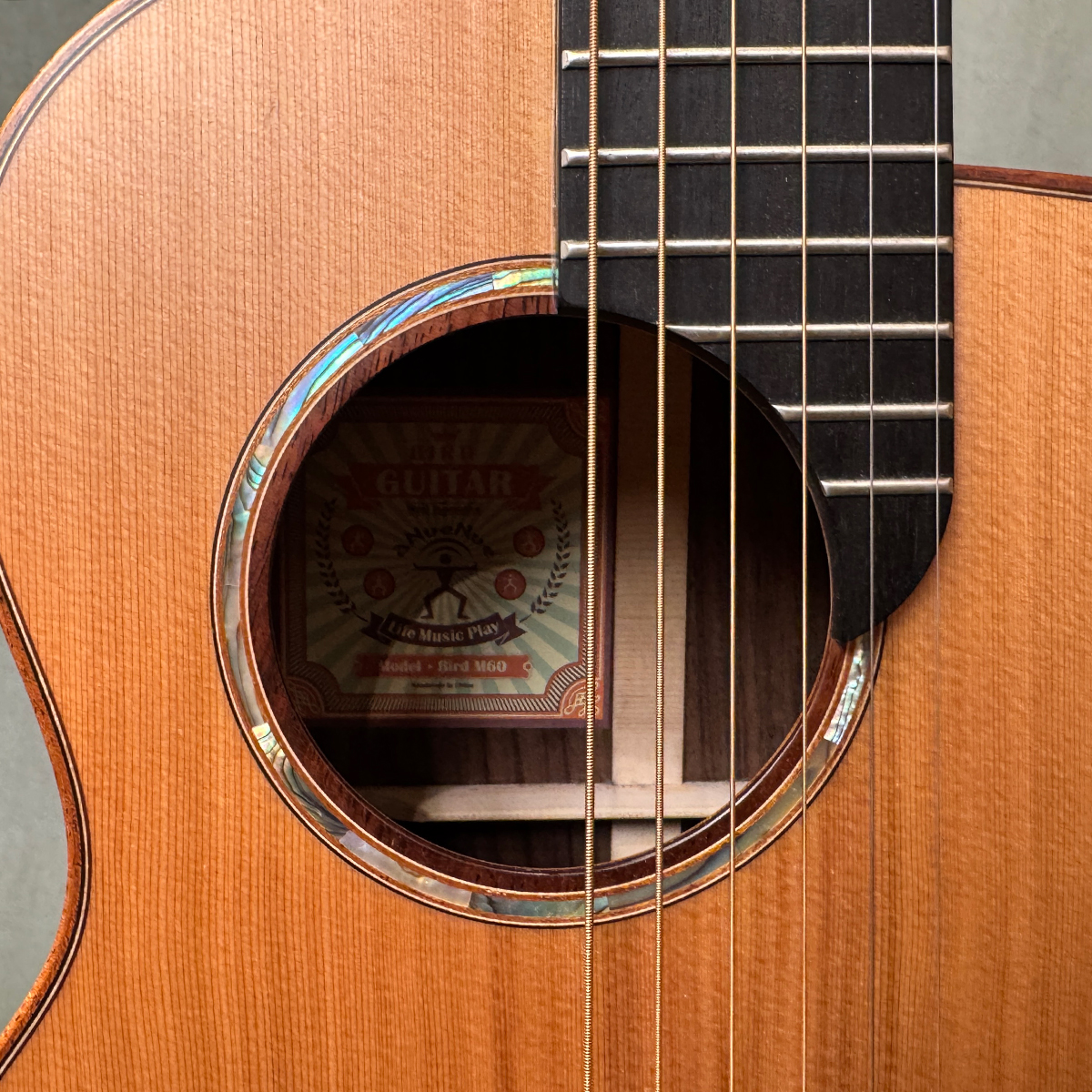 人気モデルがほぼ未使用の状態で入荷杉単板、ローズ合板サイドバックマホガニーバインディング、アバロンサウンドホールロゼッタサテンフィニッシュ、610mmスケール