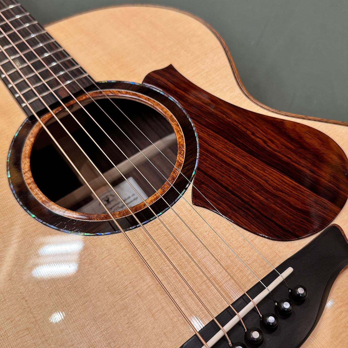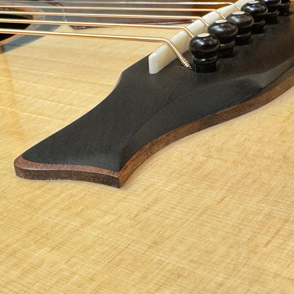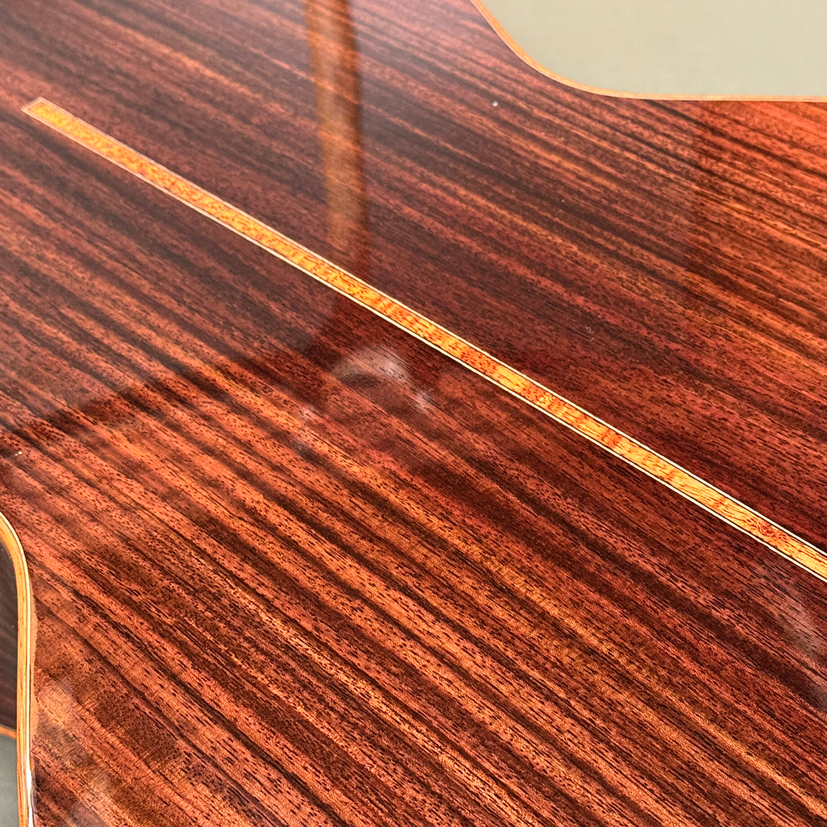 ボディーサイズに関しては、一般的なOMサイズのボディーとそれよりも少し大きめのSmall Jumboを足して2で割った形状ということで、ボリューミーでありながらフィンガースタイルに適した性質を持つ、大変珍しいシェイプです。