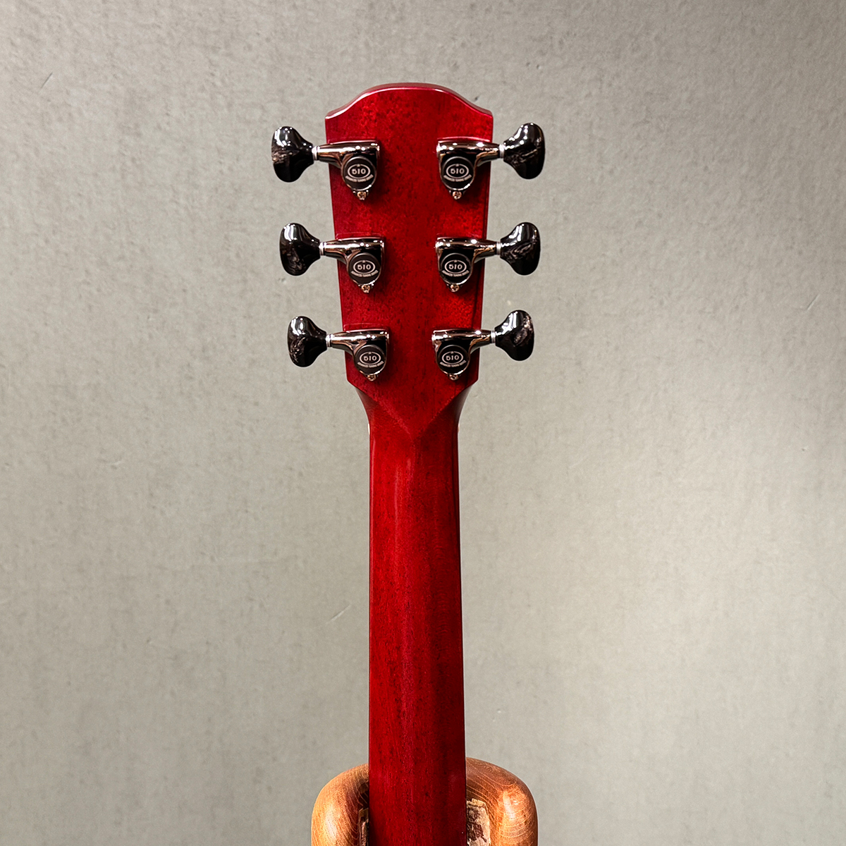 トップのヤイリギター特殊カラーであるRBカラーに合わせて、サイドバック、ネック裏に至ってシースルーレッドで着色。エンジェルシリーズのヘッドロゴを矢じりのみに変更。