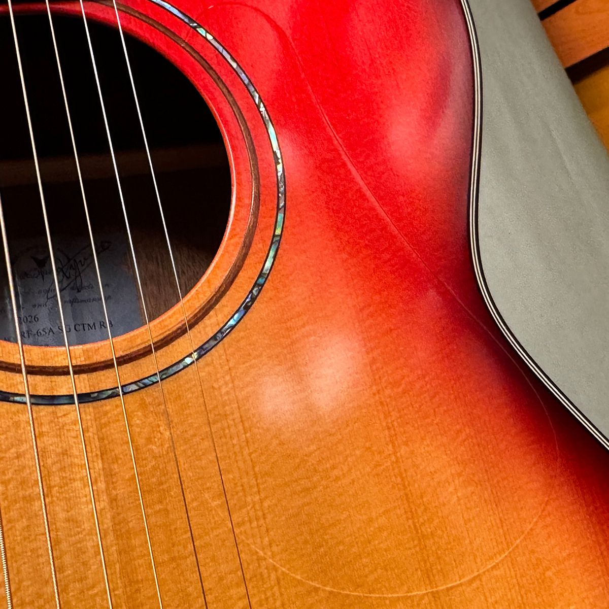 クラシックギターサイズのアコギとしてフィンガーピッカーに人気の高いRF-65! ピックガードは透明素材が塗装したに張られた、木目を見せる製法。どれも熟練の職人技が必要な工程です。通常マットな艶なし仕上げの塗装となりますが、こちらは下倉楽器特注のセミグロスフィニッシュ。トップ材の振動をより生かすためにXブレースに穴を穿ったエアリーブレースを採用しています。