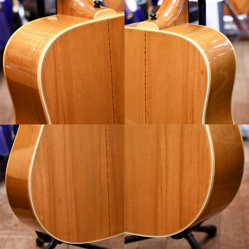 トップにスプルース単板、そしてサイド&バックにはアコースティックギターとしては極めて稀な アッシュ材 を採用。ローズウッドの重厚さとマホガニーの軽快さを併せ持ったような、分離が良くクリスピーなトーンが最大の特徴です。ギルド伝統のドレッドノート・シェイプが生み出すパワフルな音圧に、アッシュ特有の輪郭のはっきりした高域が加わり、ストロークでは圧倒的な音抜けを、フィンガーピッキングでは一音一音が際立つ解像度を誇ります。バインディングやインレイの装飾も美しく、実戦派かつコレクタブルな魅力に溢れた一台です。