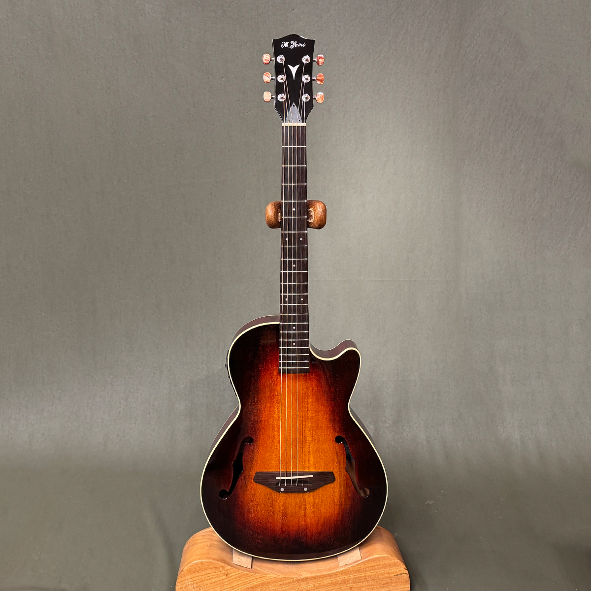 まるでレスポールの様な奥行!奇抜なギターを作らせたら他にはいない、ヤイリギターの特殊エレアコKYFシリーズ。バイオリンやジャズギターのようなF字型のサウンドホールはデザイン性も兼ねていますが、ステージでのハウリングを防ぐために考案されたもので、ボディー内部の共鳴もできる限り抑えられた構造になっております。自宅での音出しにも最適で、サイレントギターの代わりに使われている方もいるようです。