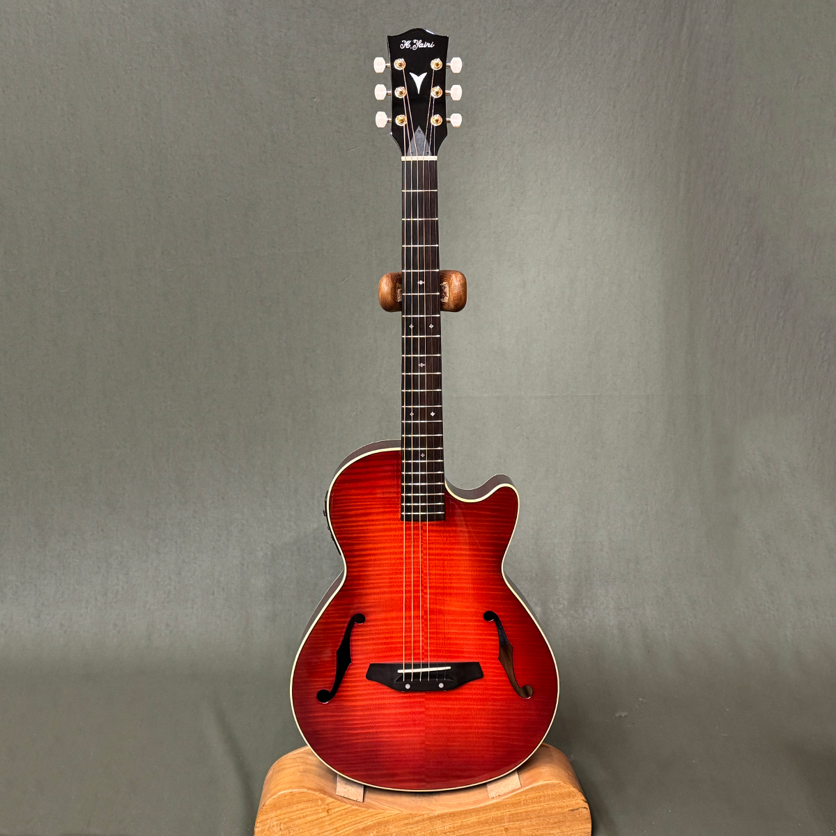まるでレスポールの様な奥行!奇抜なギターを作らせたら他にはいない、ヤイリギターの特殊エレアコKYFシリーズ。バイオリンやジャズギターのようなF字型のサウンドホールはデザイン性も兼ねていますが、ステージでのハウリングを防ぐために考案されたもので、ボディー内部の共鳴もできる限り抑えられた構造になっております。自宅での音出しにも最適で、サイレントギターの代わりに使われている方もいるようです。おススメです。