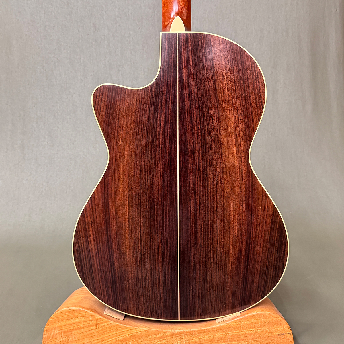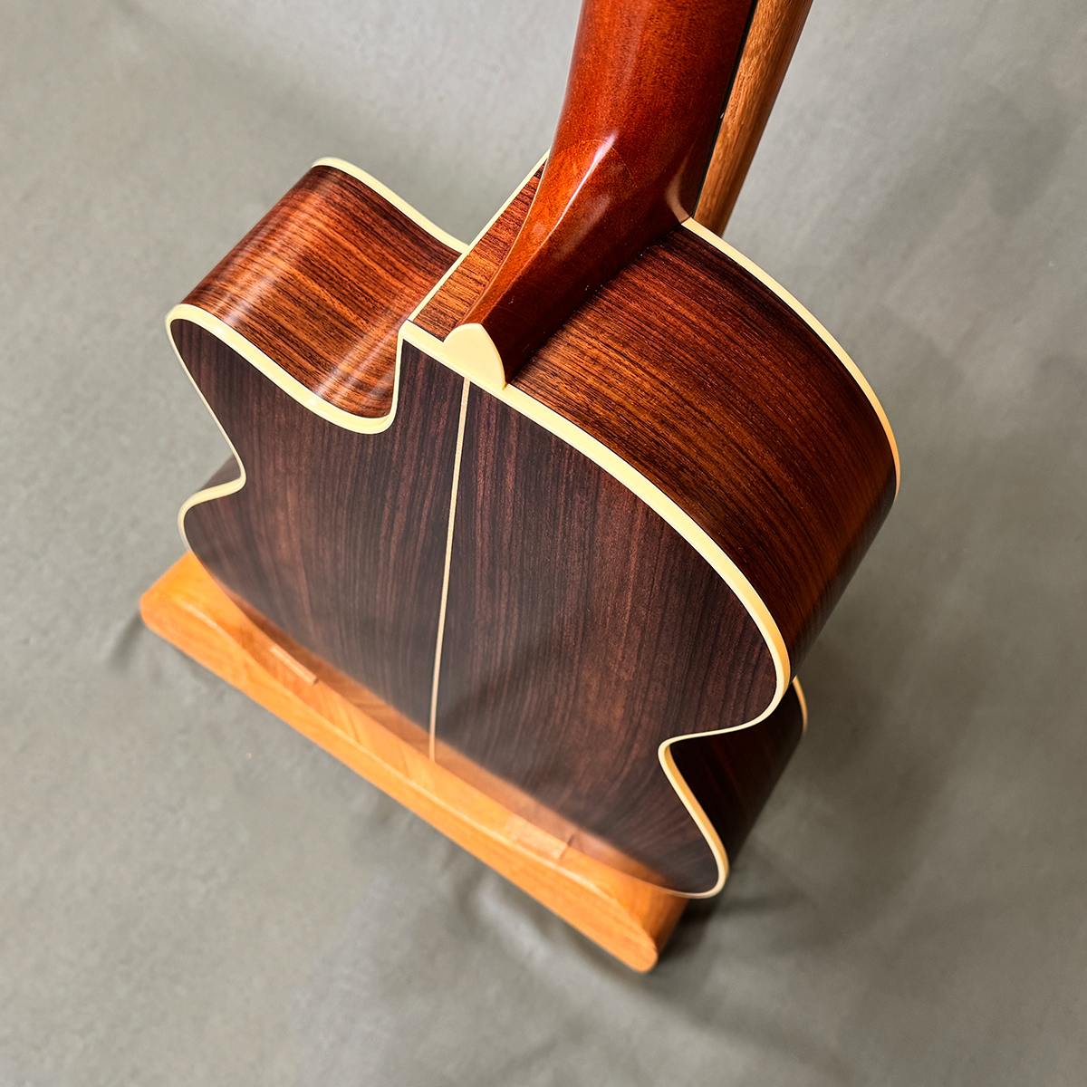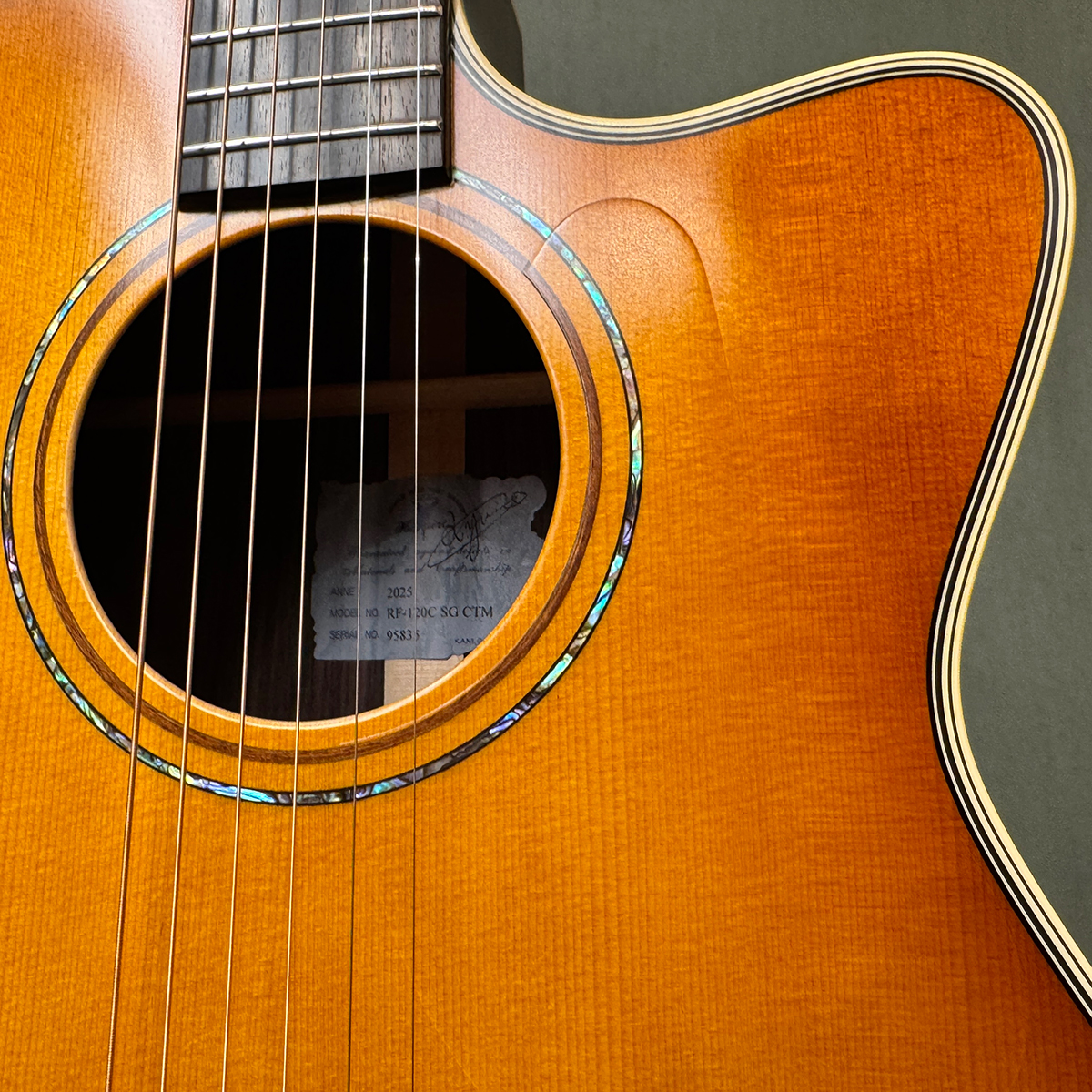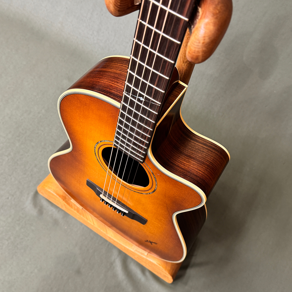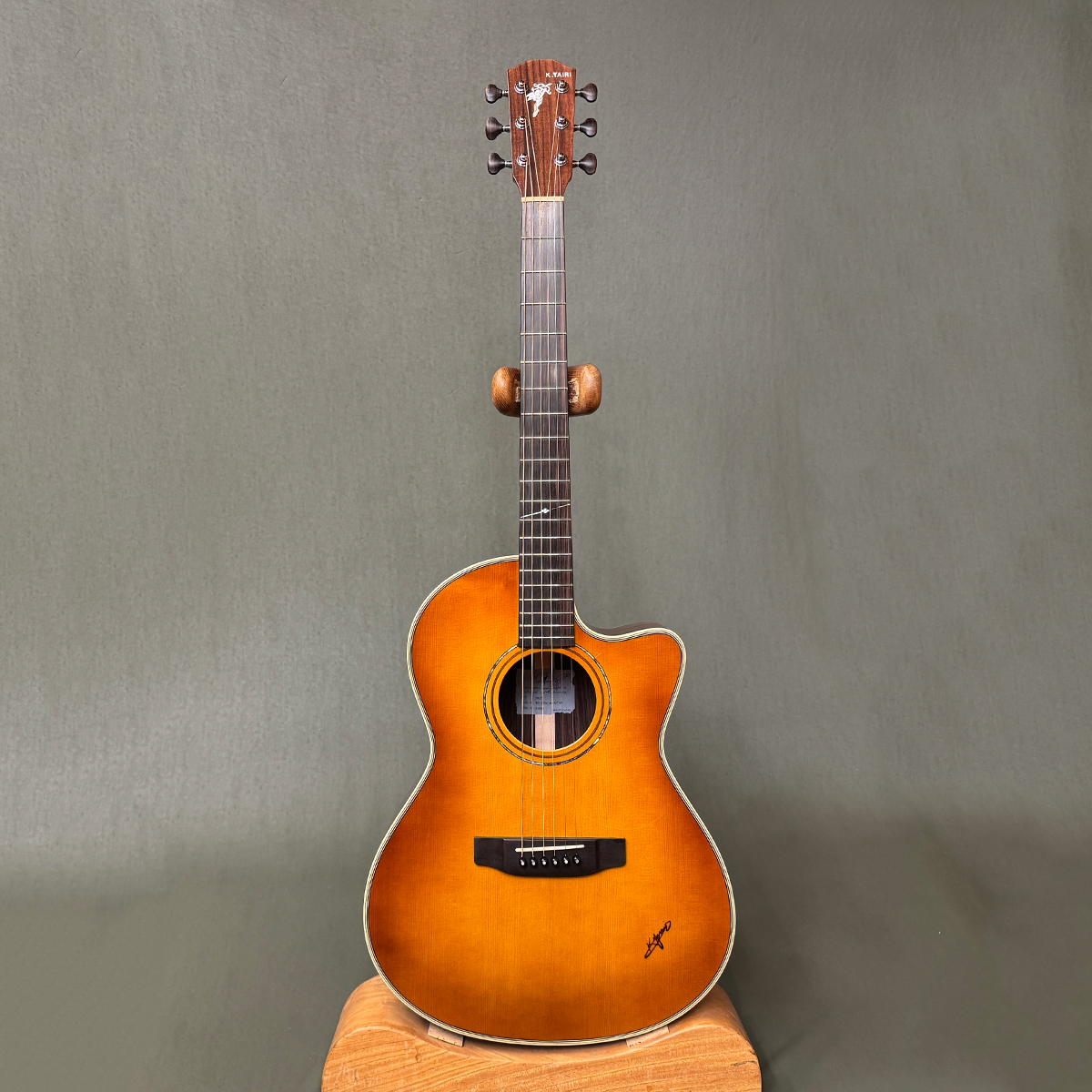 本器は当店からの特注仕様で、淡い飴色のグラデーションが美しいアンバーバーストを、半つや出し仕上げにして頂いた1本です。スプルース・インドローズの全面単板であり、純国産ヤイリギターの職人の手によってハンドメイドで組上げられる、ヤイリギターの中でも特に人気のモデルです。ヤイリギターのフラッグシップモデルともいえる本器は、クラシックギターのボディーラインを採用したフォークギターとして80年代からヤイリギター独特のボディータイプとして人気があります。90年代初頭から多くの有名ミュージションが特注することにより、メディアでの露出も増え、同様のモデルを注文する方が絶えません。