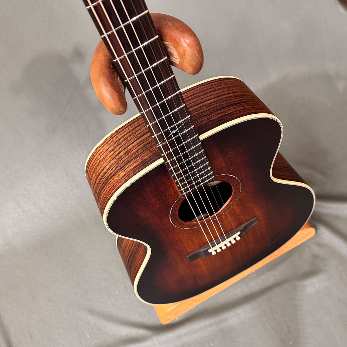 ドレッドサイズのボディーボトムにオーディトリウムのようなくびれを併せ持つグランドコンサートタイプ。座った姿勢での持ち易さはもちろん、スタンディングでもバランスの良さには定評があります。演奏スタイルによって様々なサウンドキャラクターに変化しますが、インディアンローズ特有の奥行きの深さはストラムでもフィンガーでも味わうとことが出来ます。万能な1本をお探しの方おススメです。