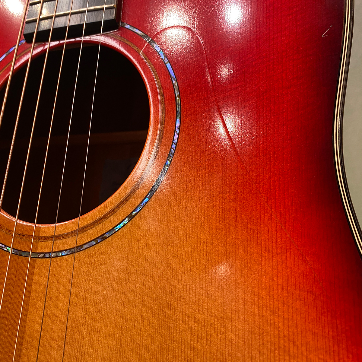 ピックガードは透明素材が塗装したに張られた、木目を見せる製法。どれも熟練の職人技が必要な工程です。通常マットな艶なし仕上げの塗装となりますが、こちらは下倉楽器特注のセミグロスフィニッシュ。トップ材の振動をより生かすためにXブレースに穴を穿ったエアリーブレースを採用しています。