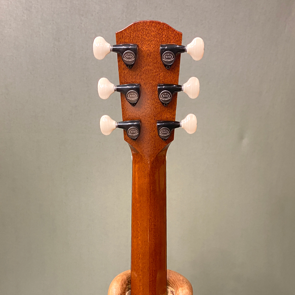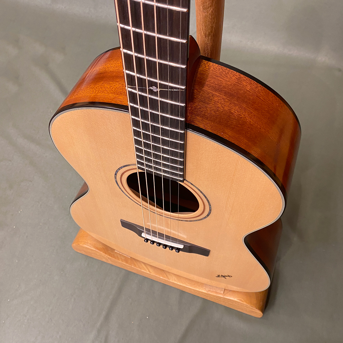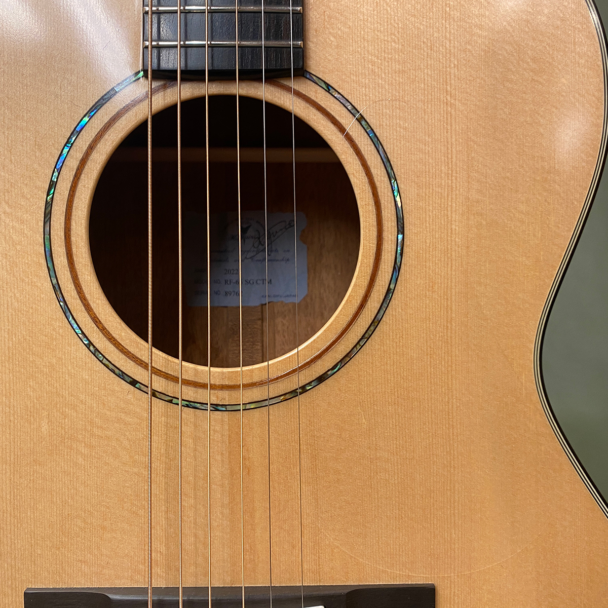 クラシックギターサイズのアコギとしてフィンガーピッカーに人気の高いRF-65! ピックガードは透明素材が塗装したに張られた、木目を見せる製法。どれも熟練の職人技が必要な工程です。通常マットな艶なし仕上げの塗装となりますが、こちらは下倉楽器特注のセミグロスフィニッシュ。トップ材の振動をより生かすためにXブレースに穴を穿ったエアリーブレースを採用しています。