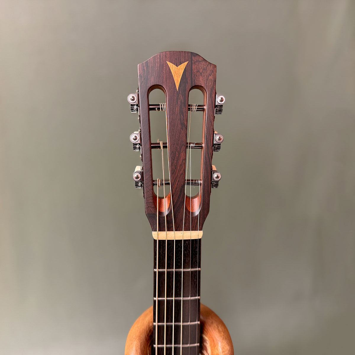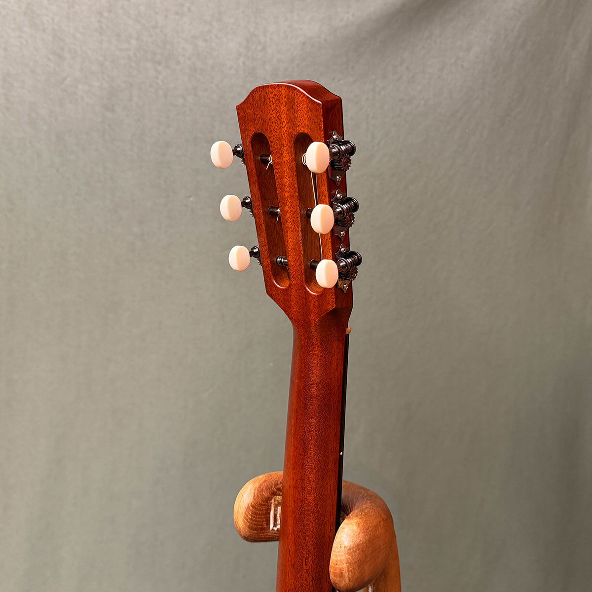 エアリーブレース、マホガニートップ単板、609mmスケール、43mmナット、マホガニー埋め込みロゴ、2本限定で製作していただいたニューヨーカーのオールマホ仕様。歯切れのよいサウンドはスプルーストップのオリジナルとは異なる余韻を生み出します。味が出るまで延々と弾き続けて頂きたい1本です。