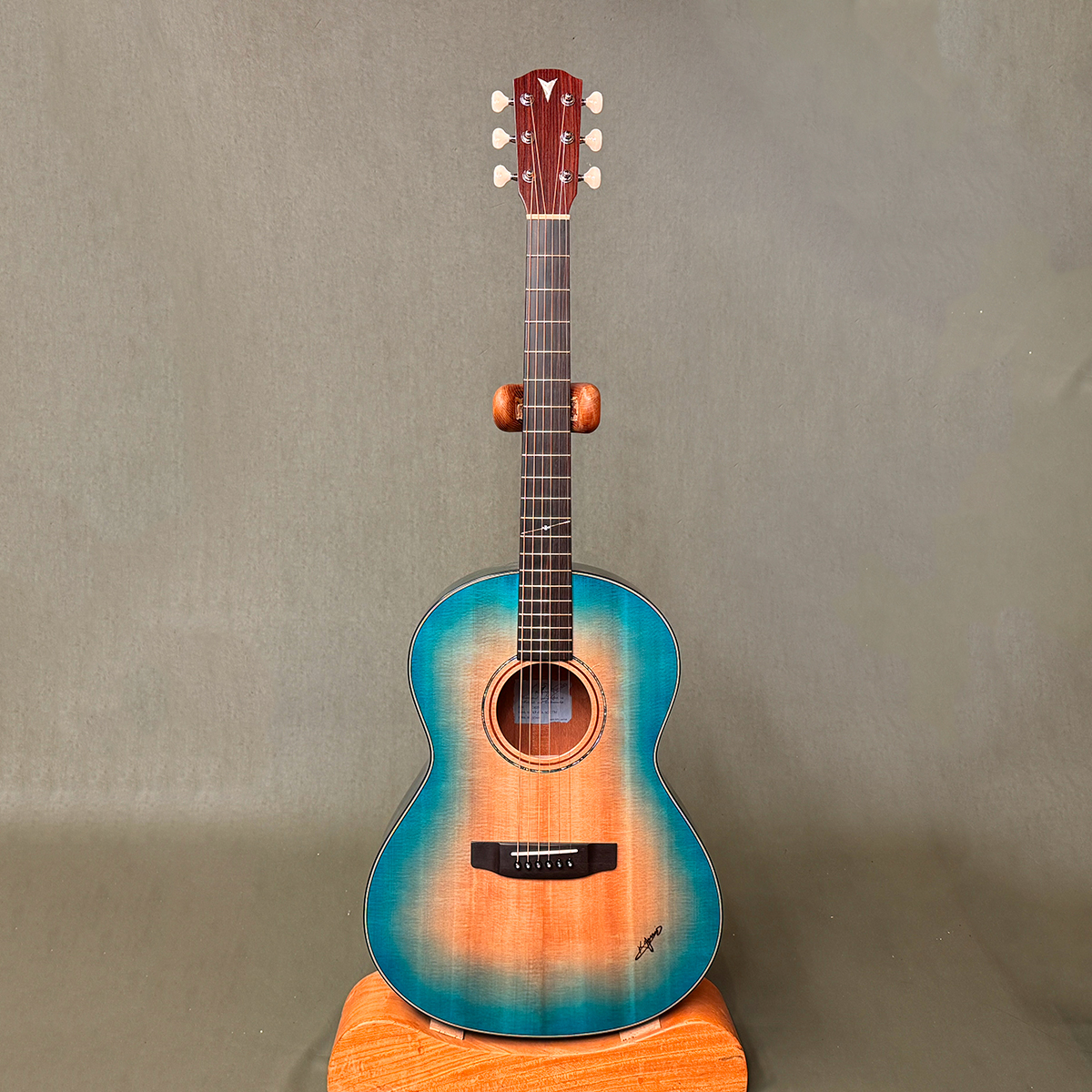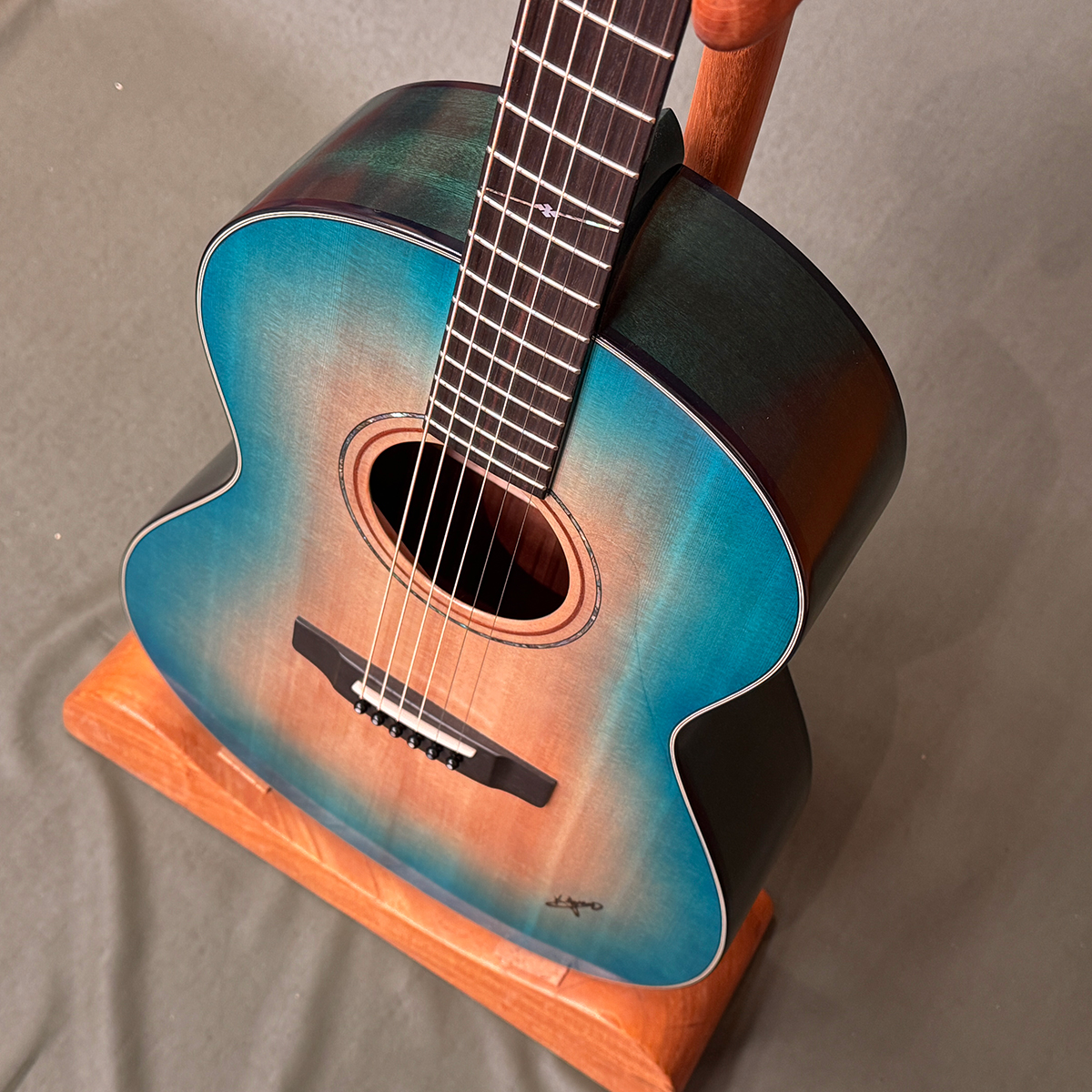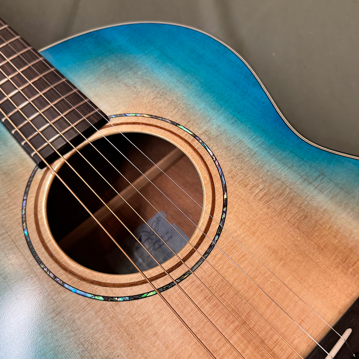クラシックギターサイズのアコギとしてフィンガーピッカーに人気の高いRF-65! ピックガードは透明素材が塗装したに張られた、木目を見せる製法。どれも熟練の職人技が必要な工程です。通常マットな艶なし仕上げの塗装となりますが、こちらは下倉楽器特注のセミグロスフィニッシュ。トップ材の振動をより生かすためにXブレースに穴を穿ったエアリーブレースを採用しています。