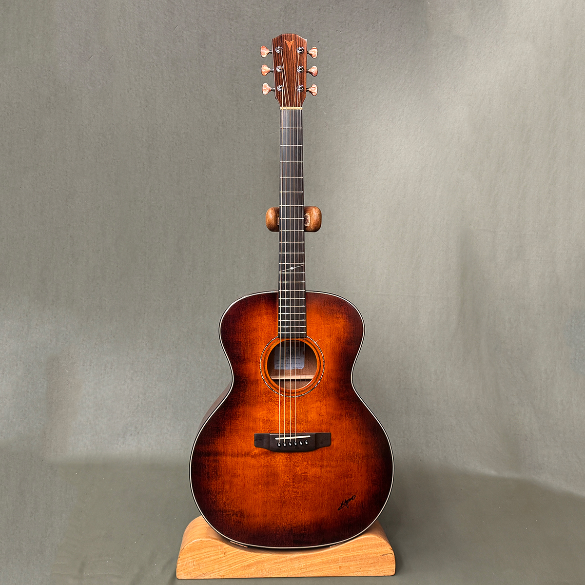 深みのあるブラウンから外周に向かって濃く落ちていくクラシックかつ上品なサンバーストで、