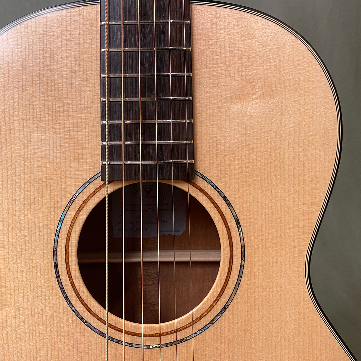 トップ材の振動をより生かすためにXブレースに穴を穿ったエアリーブレースを採用しています。
