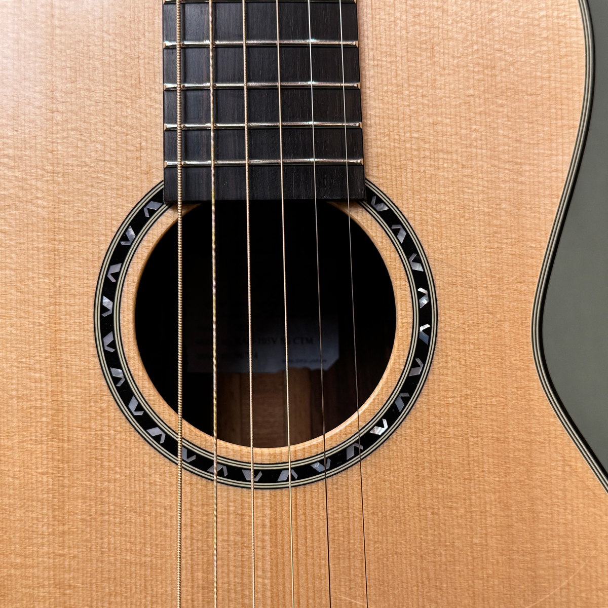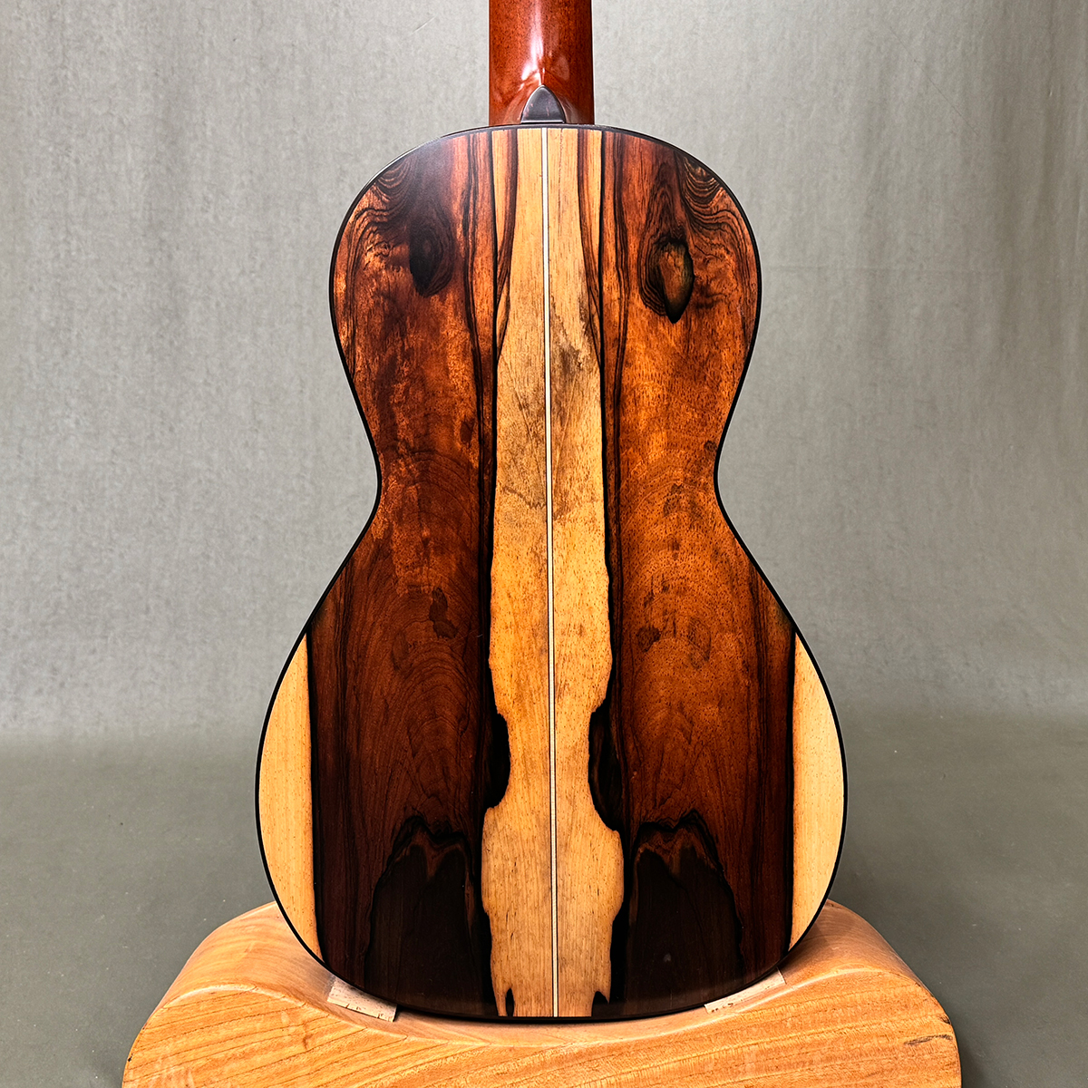 小ぶりなボディながら、ハカランダの持つ芯の強さと倍音の豊かさが加わり、フィンガースタイルやブルース、古いフォークソングとの相性は抜群。