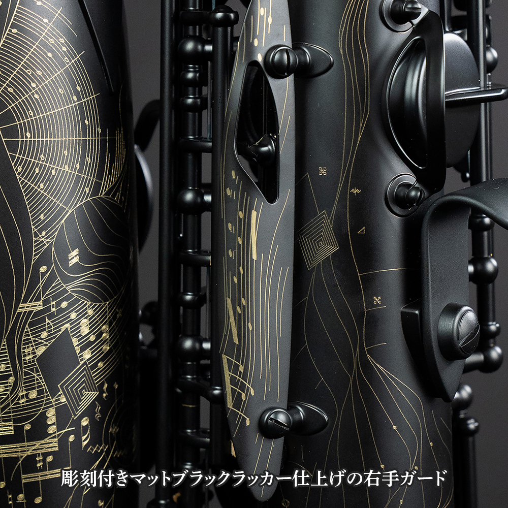 美しく輝くブラッククリスタルのキーパーツから、天然コルクが散りばめられたブラックシンセティック(合成)コルクを採用したネックに至るまで「黒」を追求したSupreme アルト&テナー『2025リミテッドエディション』は、豊かで多彩な黒のパレットを連想させます。
