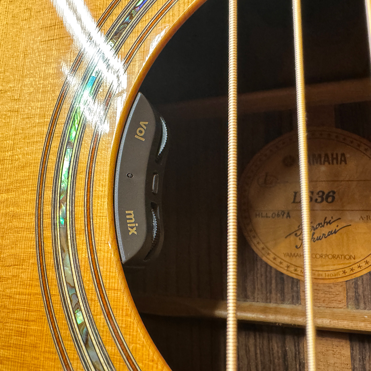 小傷はありますが全体的にきれいな状態です。ピックガードはオリジナルシェイプのまま市販の黄べっ甲柄に変更されています。ボディーサイドにジャック穴加工されていた為、当店にてL.R. Baggs Hifi Duet ¥70000相当を搭載しました。
