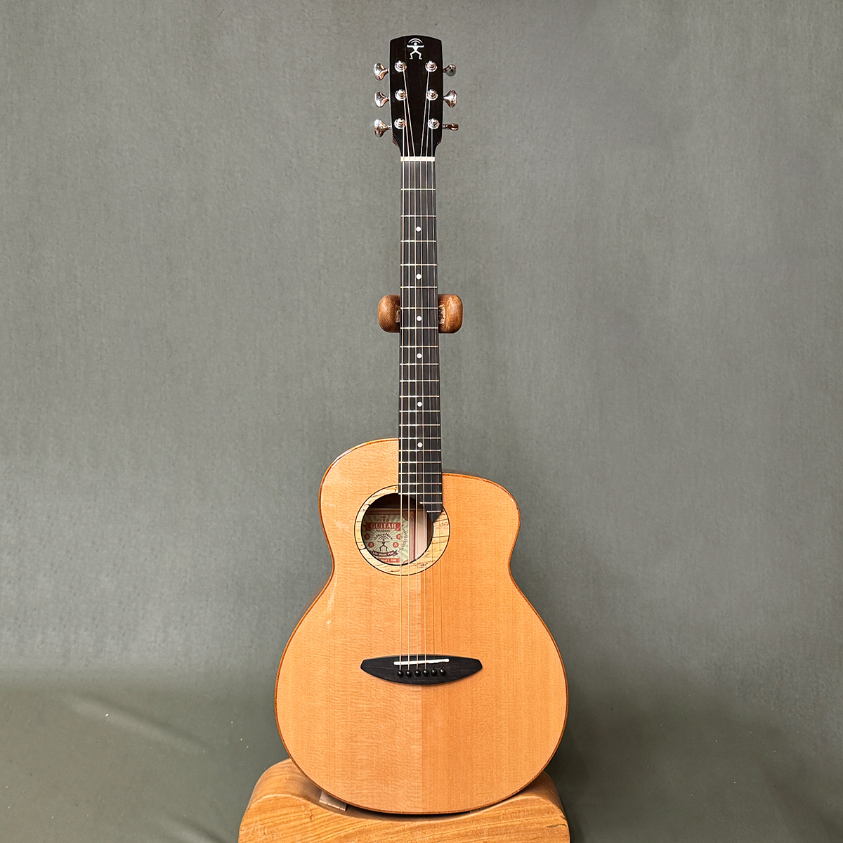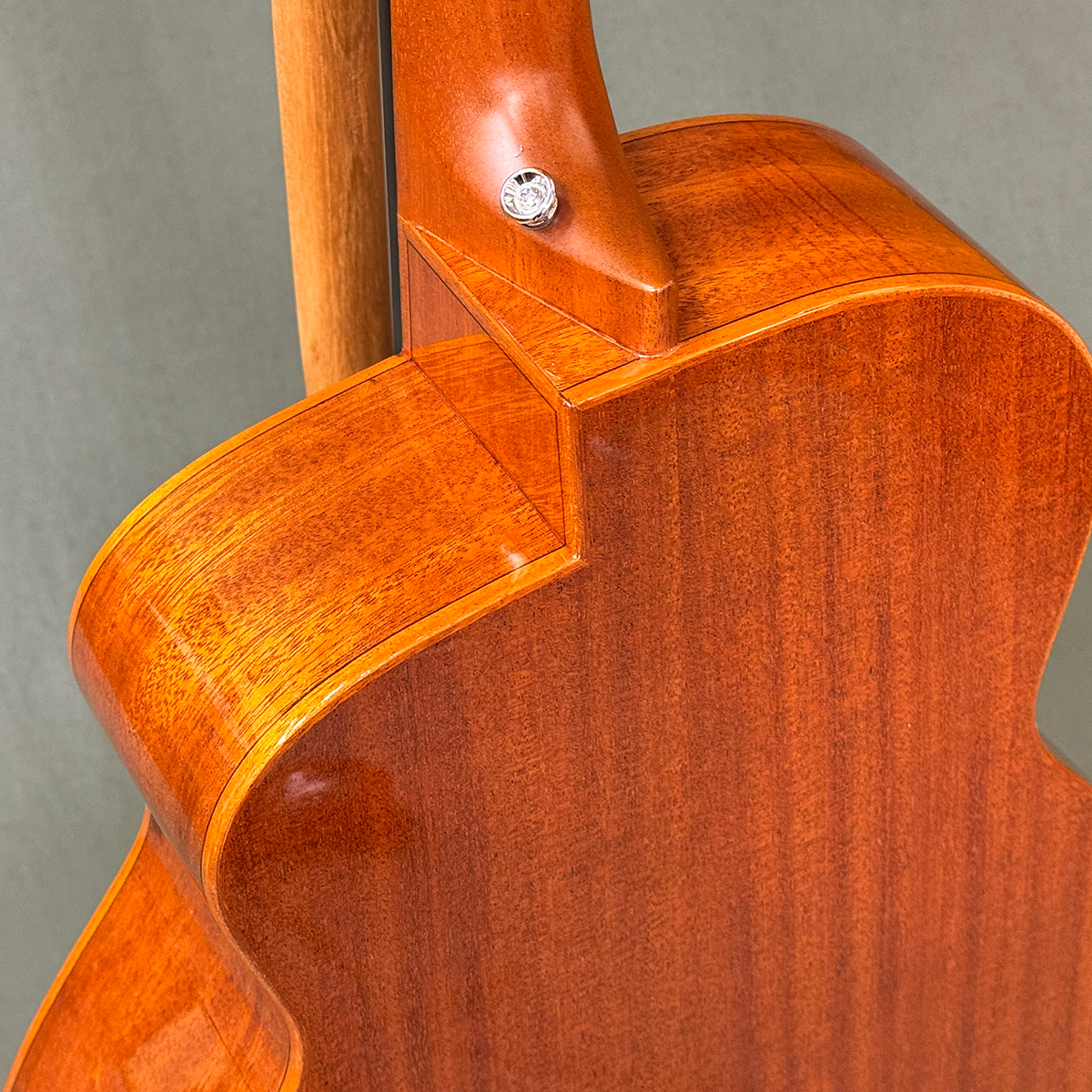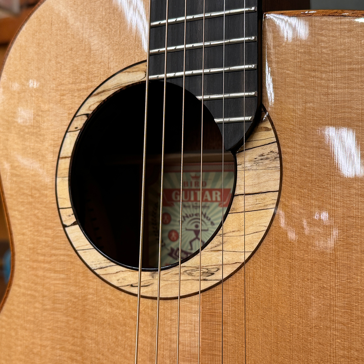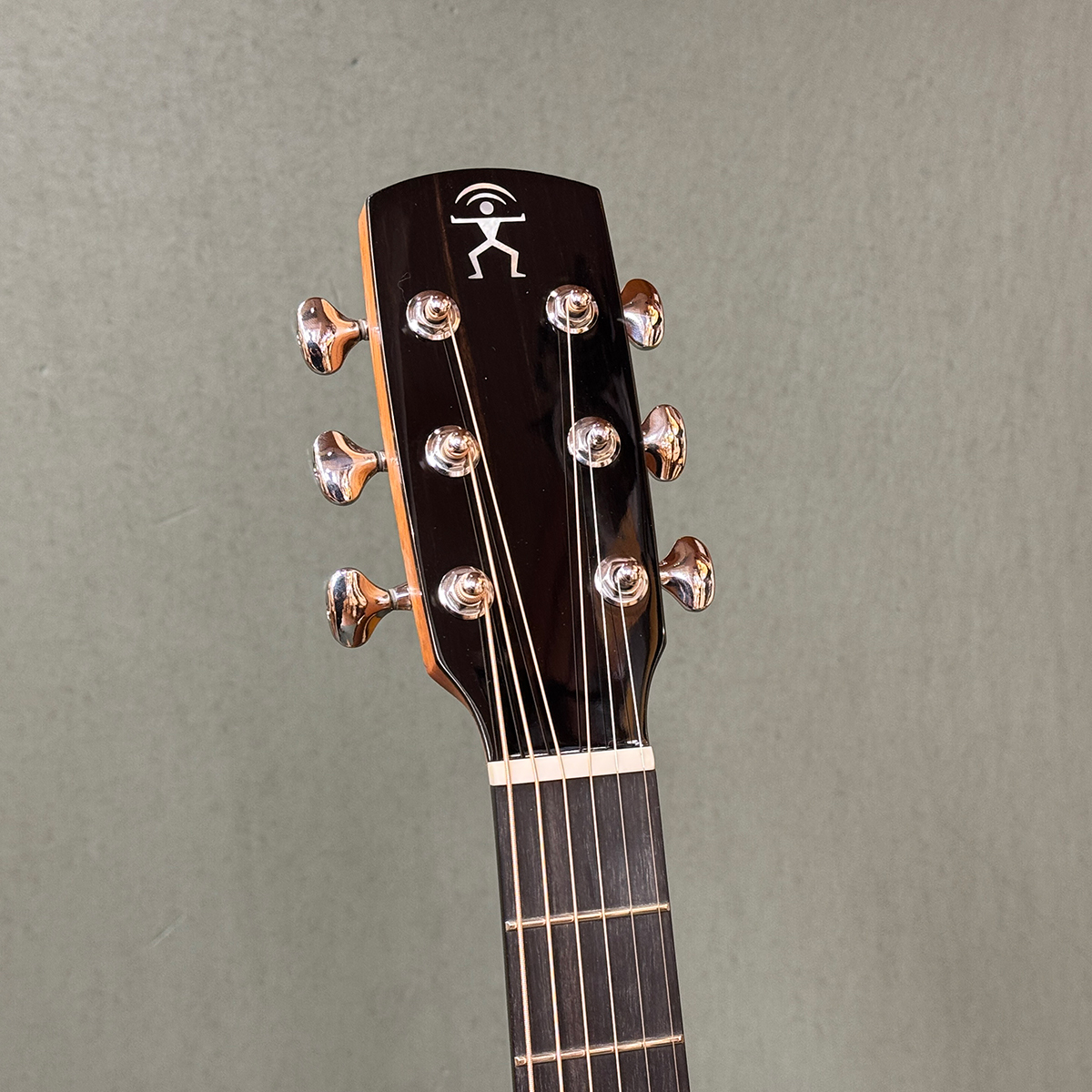 2021年のアプグレードより、確実にサウンドが変わったと、国外内で評価の高いLシリーズ。個人製作家の杉田健司氏とのコラボレーションで、ブレーシングなどの構造を見直し、格段にレベルアップしたことにより、これまでの同価格帯の全面単板モデルの常識を覆したといわれています。エボニー天神とスポルテッドマンゴーの口輪がルシアー物を思わせるワンランク上のデザインです。