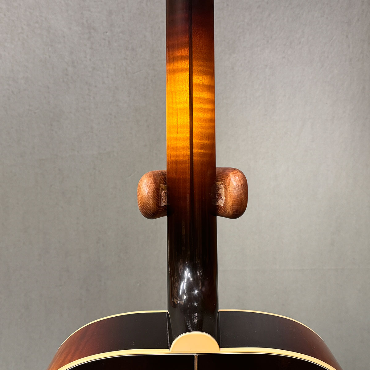 アニマルグルーといい、日本でいう膠(にかわ)を用いて接着する伝統工法で組み込まれ、ボディー全体の一体感が強く、年を重ね引き込まれることによってさらに全体の鳴りが強く変化します。サウンドの要である表板やブレーシングに加えて重要なネックジョイントも膠で接着することにより、よりタイトにヘッド振動をボディーに伝える役割を担っています。