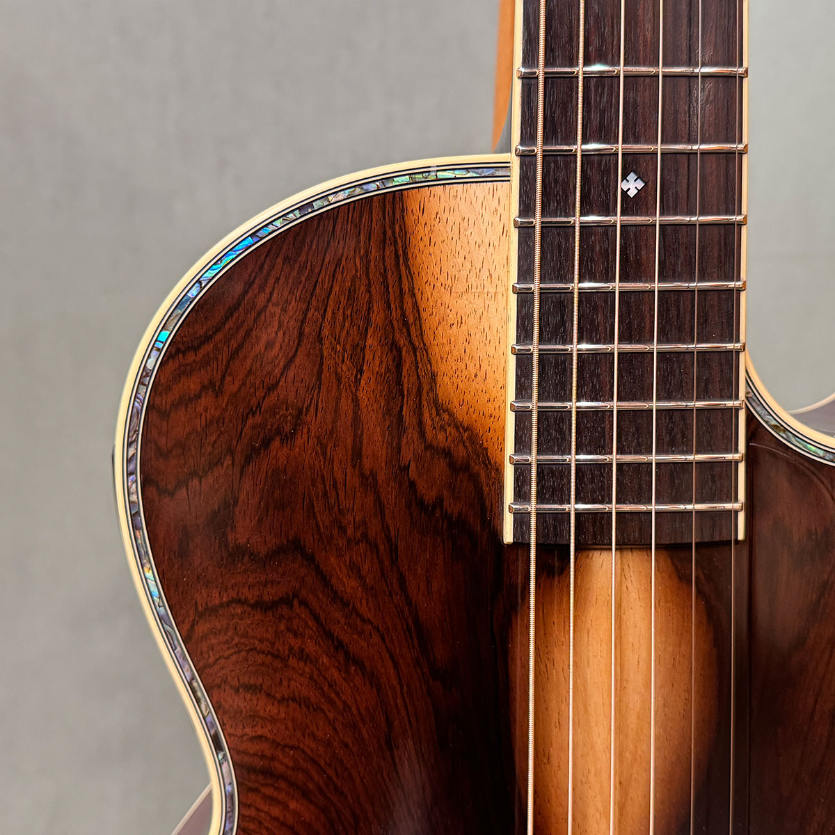 サップの混ざった特殊な木目の2ピース材を使用します。ヘッド天神にもハカランダを用い、糸巻きはジリコーテつまみのGotoh製 SGV510-ZS-CKを採用します。