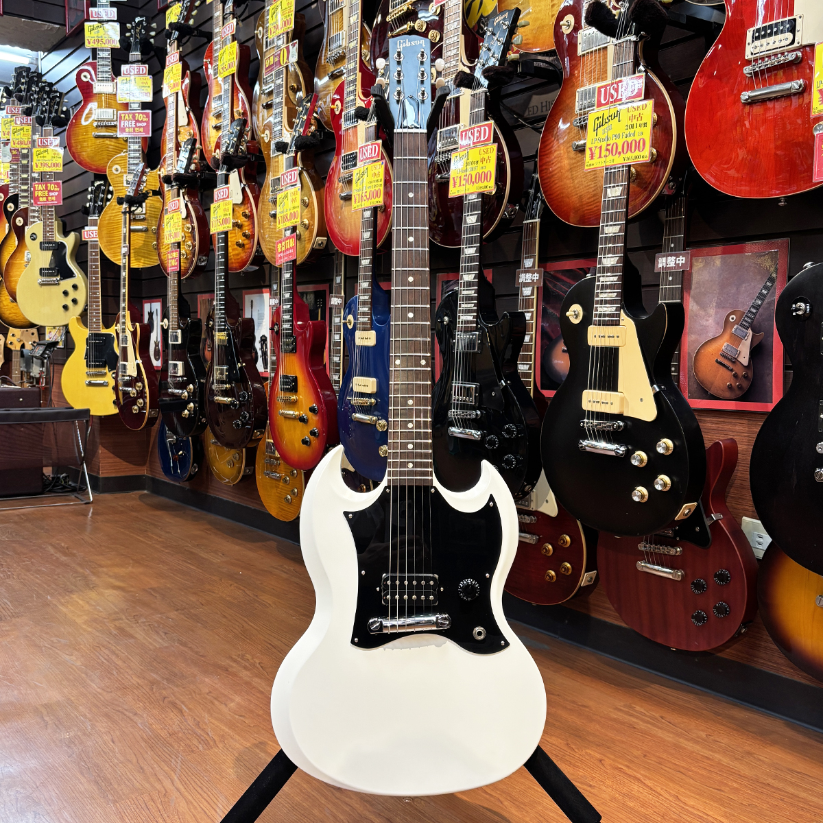 コンター加工が施された超薄型ボディで軽量化による取り回しの良さに加え、ハイポジションの演奏時もストレスフリーなダブルカッタウェイ仕様のボディには、ラージピックガード、シンプルなドットポジションマークが印象的な”SG“。