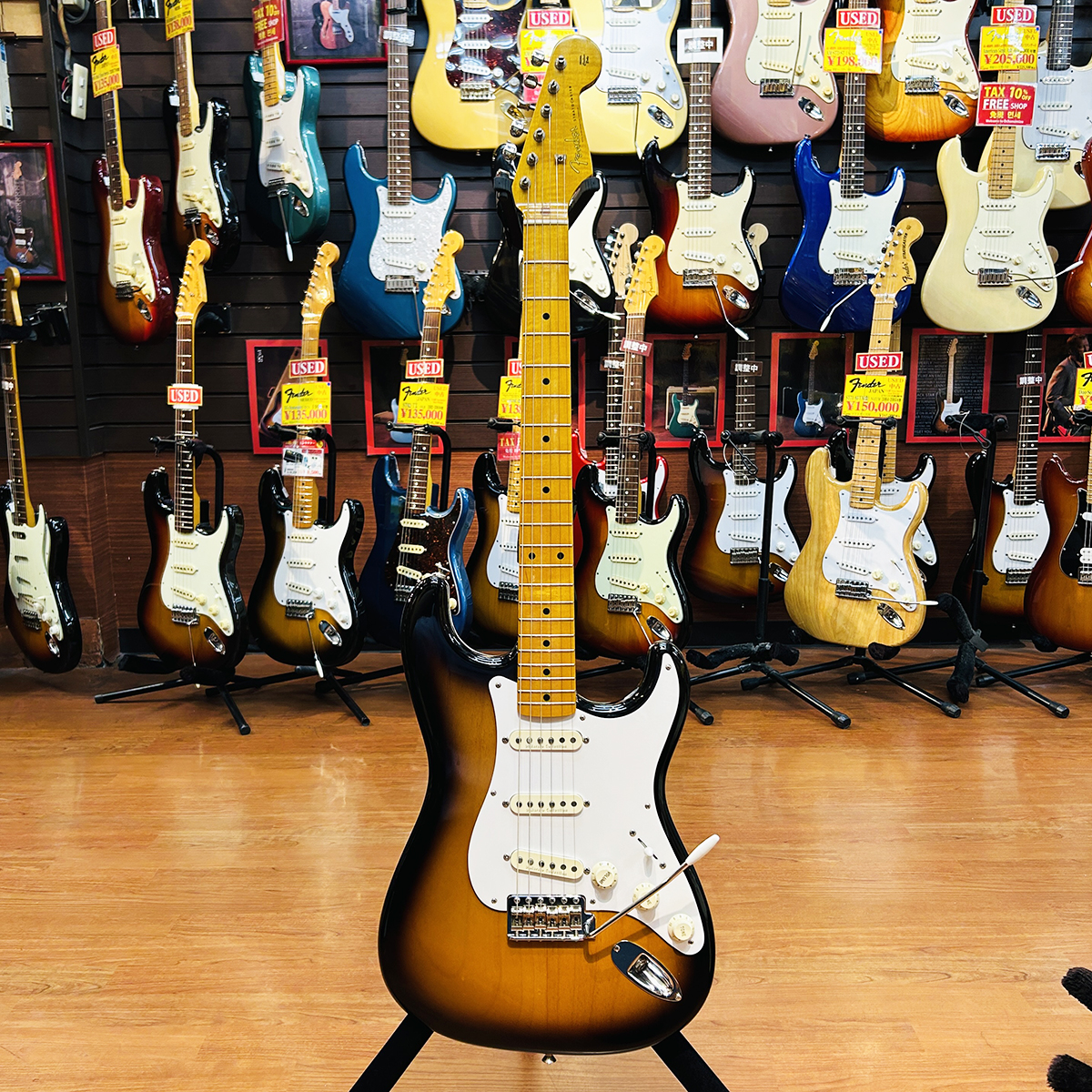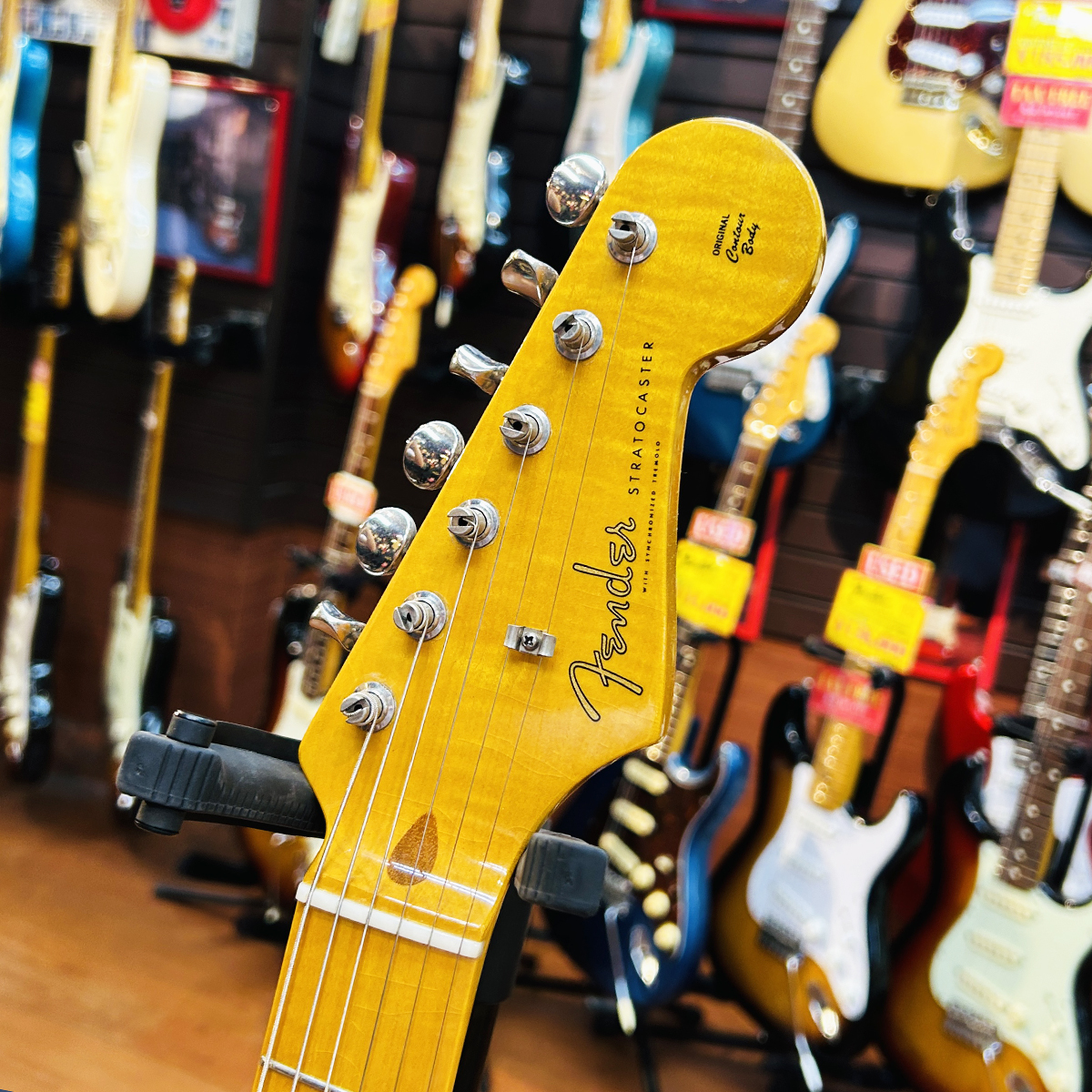 本器は、スモールヘッドにスパゲティロゴをはじめ、カモメ型のストリングスガイド、1プライのピックガードとシンプルなルックスが印象的な57バージョン・ストラトキャスター。