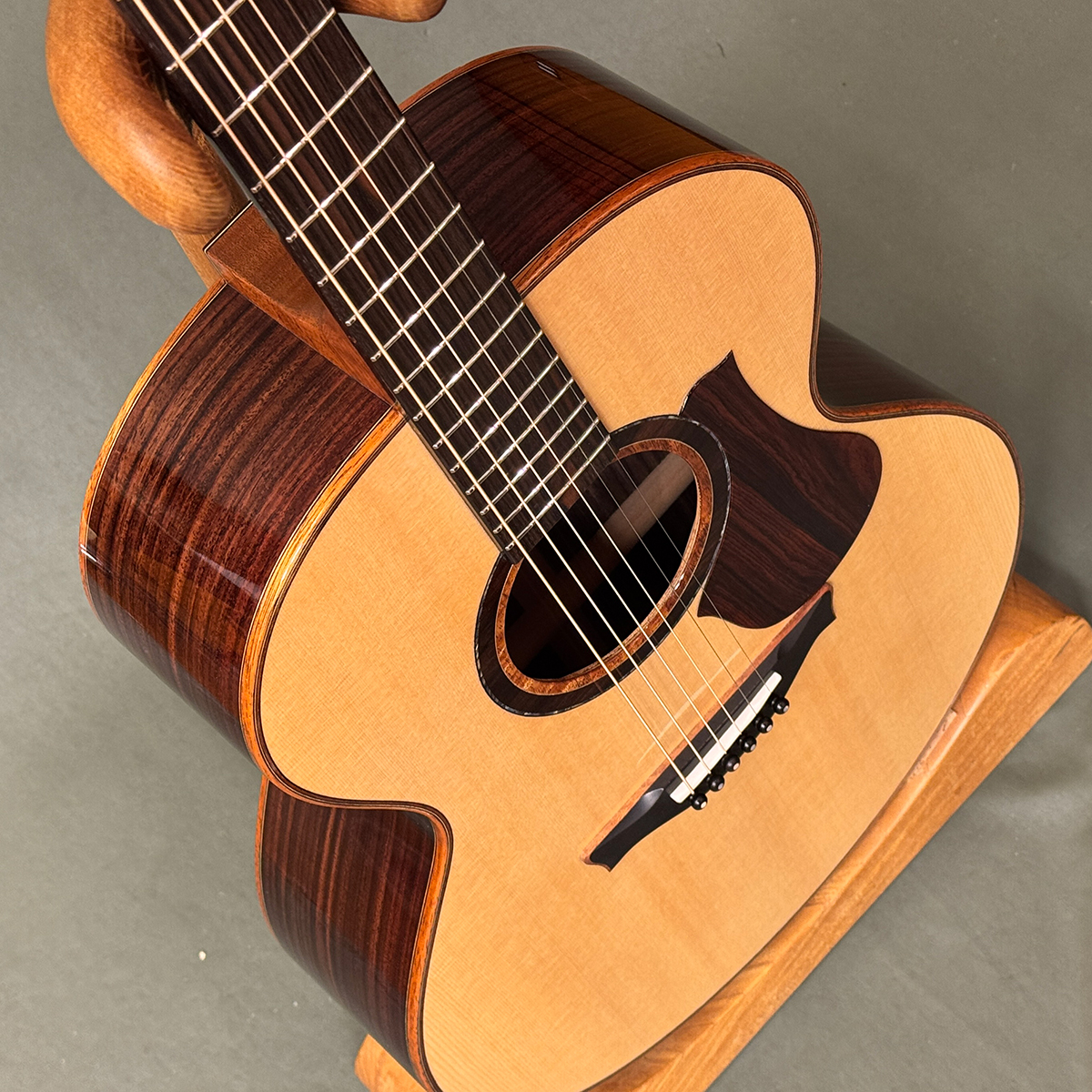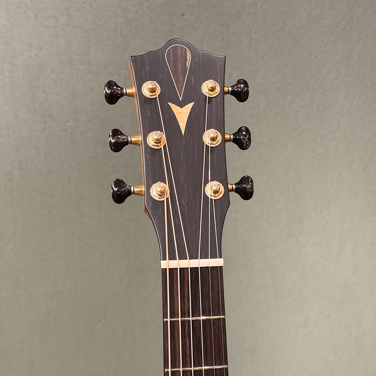 ボディーサイズに関しては、一般的なOMサイズのボディーとそれよりも少し大きめのSmall Jumboを足して2で割った形状ということで、ボリューミーでありながらフィンガースタイルに適した性質を持つ、大変珍しいシェイプです。