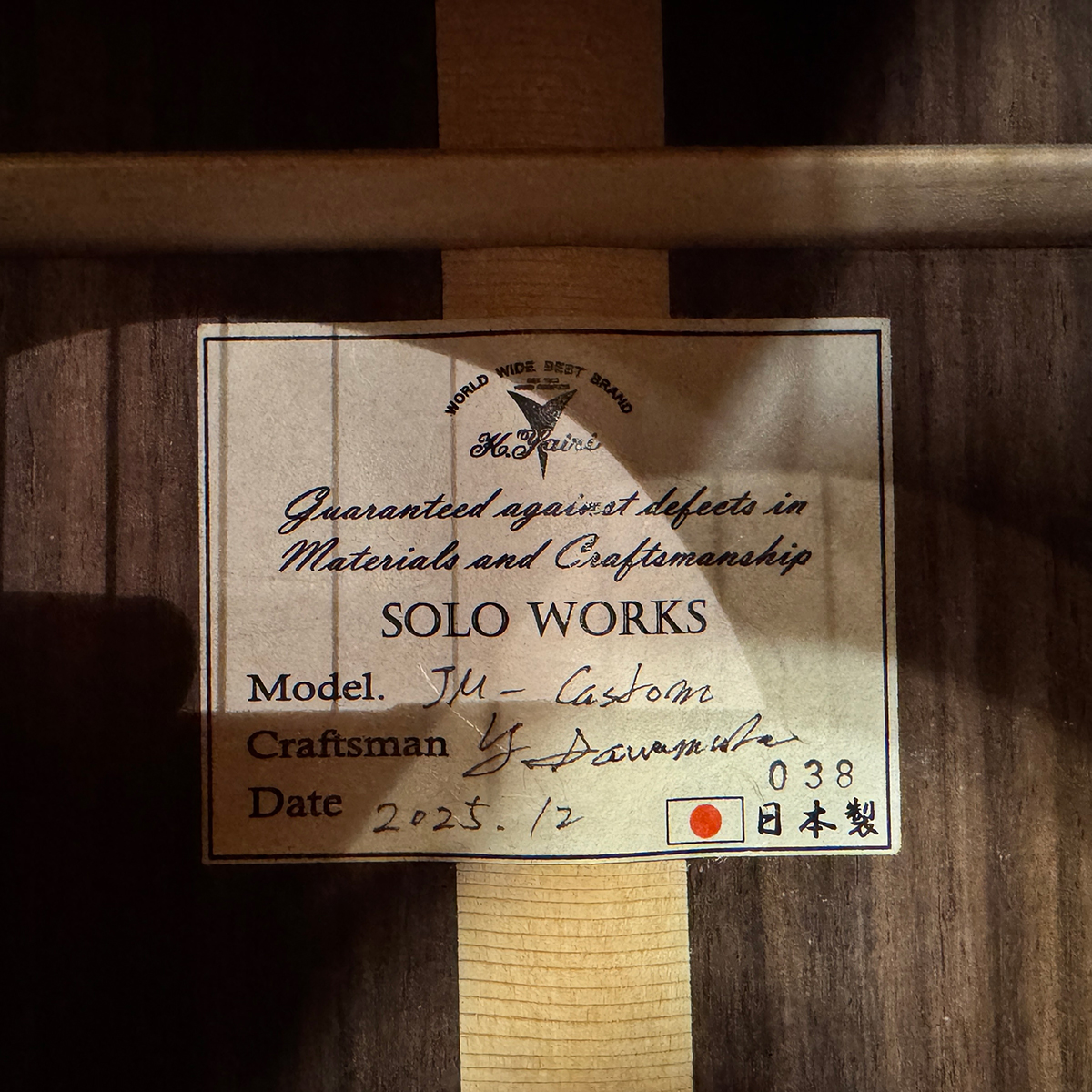 分業制で定められた数だけを生産するという印象の強いヤイリギターですが、個々の職人のノウハウや創造性は高く、独自の考えを組み入れた特別な仕様のモデルを個人作業のみで仕立て上げるのが『ソロワークス』中でも次代を担う若手製作家は多く、Youtubeでも取り上げられている、この澤村氏もその逸材の一人です。