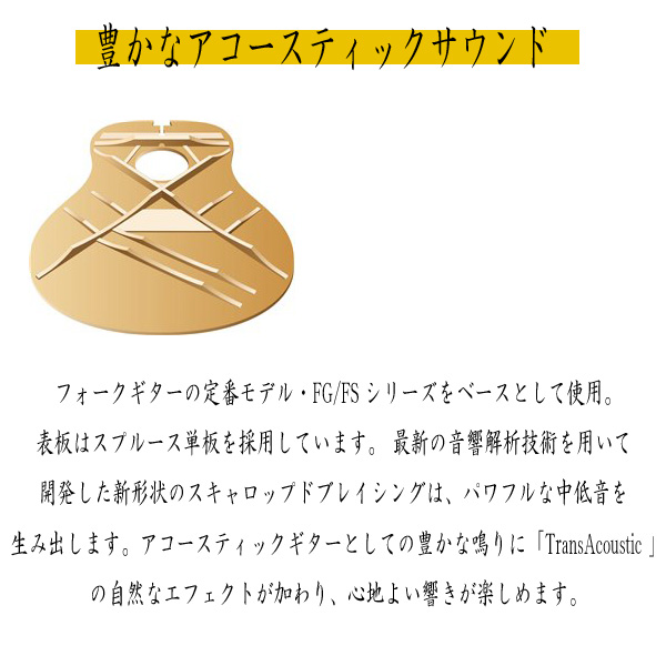 アンプや外部エフェクターを使用することなく、ギターの生音にリバーブ、コーラスのエフェクトをかけ、これまでにない演奏体験が楽しめるトランスアコースティックギター。ヤマハ伝統の「FG」ボディによる優れたレスポンスとパワフルなサウンドが魅力。