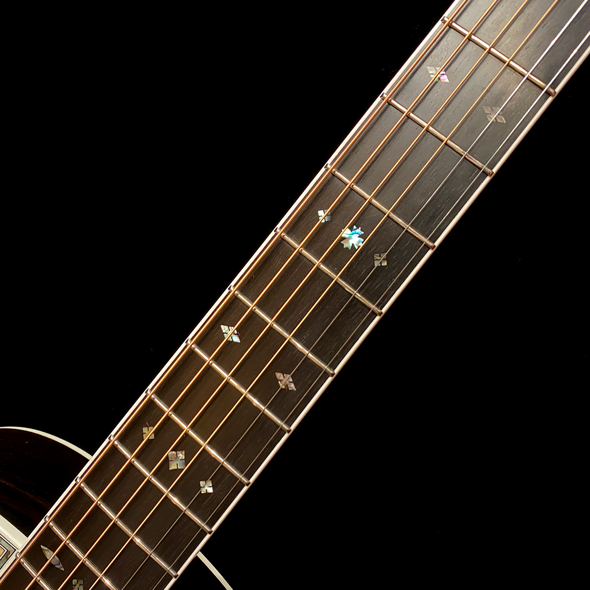 ヤイリギターの個人製作カスタムショップの双頭、丹羽氏による渾身の力作です。今回はニューヨーカータイプのOOに高級材を用いた、スゴイギターを作ってくださいという依頼のみで、あとはお任せでした。木材の選定を行うキーパーソンの丹羽氏が選定した特別に良いと思われる材料を使用したということです。インレイワークにもこだわりがあり、アバロンもソリッドのみ使用ということですので、光沢がひときわ美しく、サウンドはもちろん鑑賞していても飽きません。